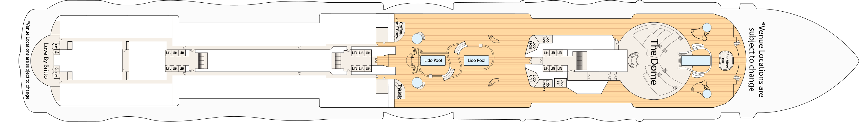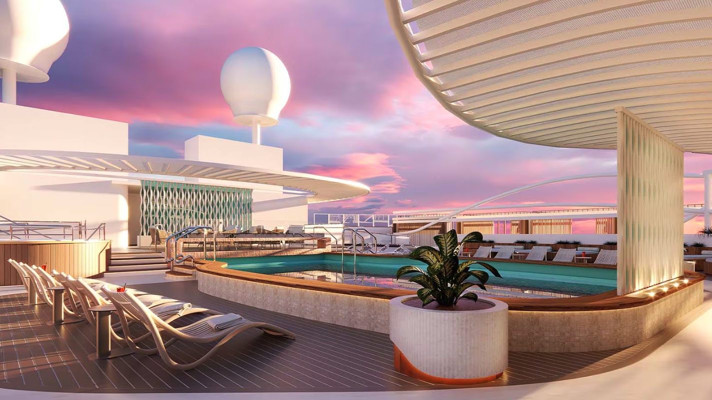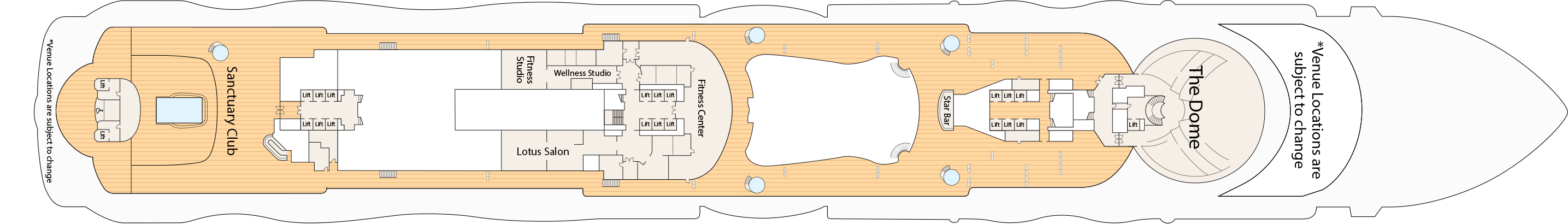 Inspired by the terraces of Santorini, The Dome is a multi-level covered deck and first-of-its-kind glass-enclosed dome ever constructed on a cruise ship. During the day, the Dome features an indoor/outdoor pool and unique water feature in a comfortable and relaxed space. At night, the pool becomes a stage, and the Dome completely transforms into an entertainment venue with a South Beach vibe, state-of-the-art lighting effects and stunning entertainment.