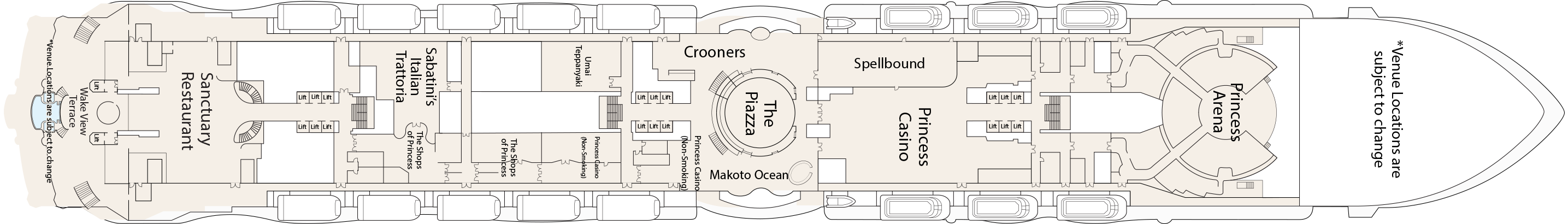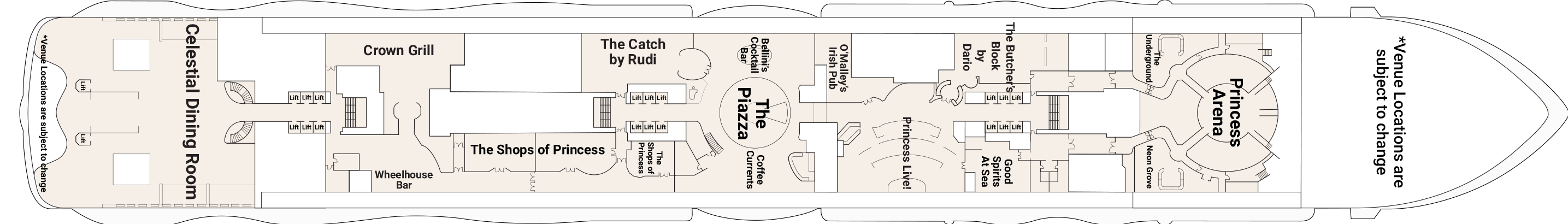Princess Live! provides non-stop entertainment throughout the day and each evening with trivia, game shows, the Daily Wake Show, live concerts and late-night comedy. Our new design is relaxed and right next to the nearby dining venues — Crown Grill and Good Spirits At Sea — seamlessly integrating your entertainment and dining favourites.