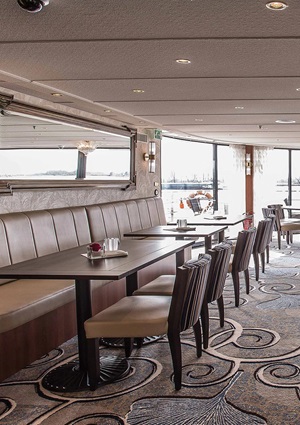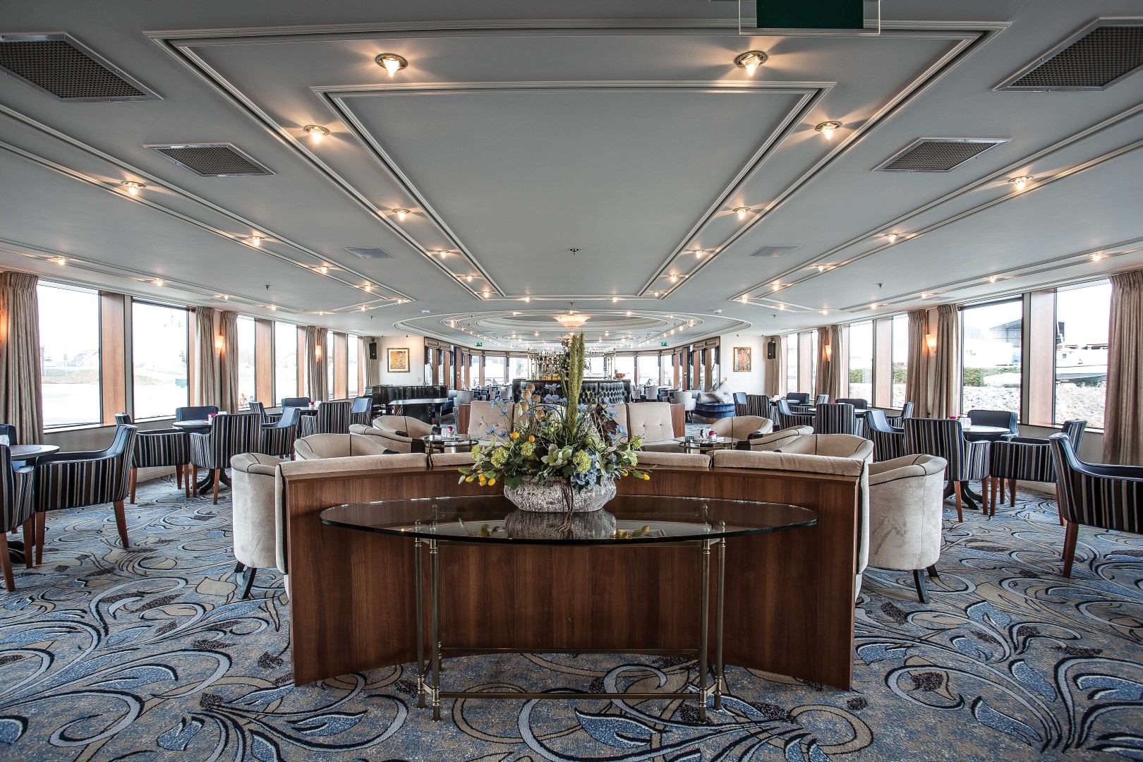 The gracious aft lounge in the stern of your riverboat sports an innovative 180° curved glass wall that opens to the fresh air (weather permitting).