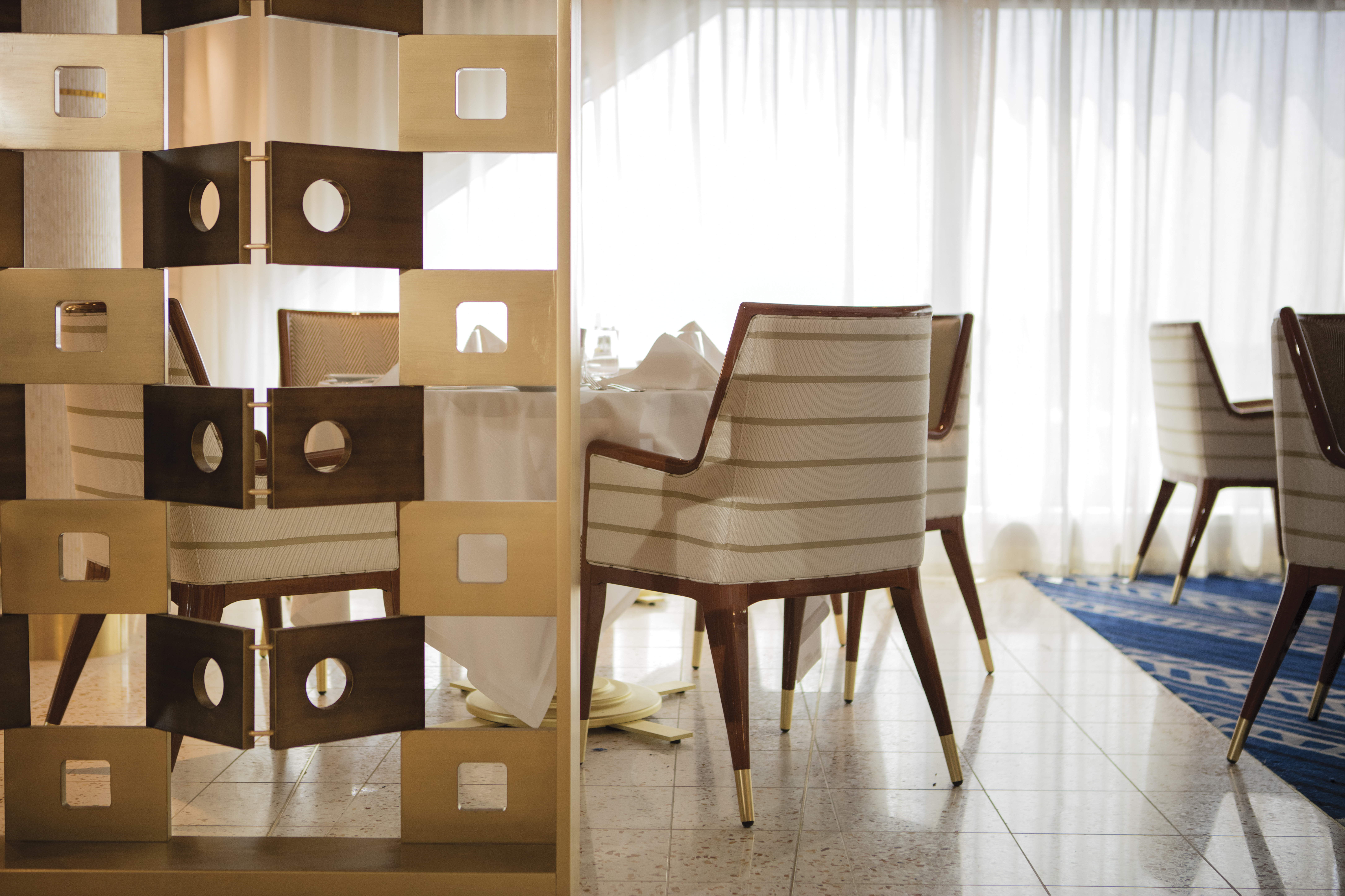 Walk through a black and gold-lit tunnel and be instantly captivated. This chic yet comfortable lounge features an impressive bar, dazzling geometric ceiling, ample seating and floor-to-ceiling windows that create a magical atmosphere. Musicians perform throughout the day, creating an alluring vibe that sets just the right mood as you unwind with a pre-dinner cocktail or satisfying nightcap.