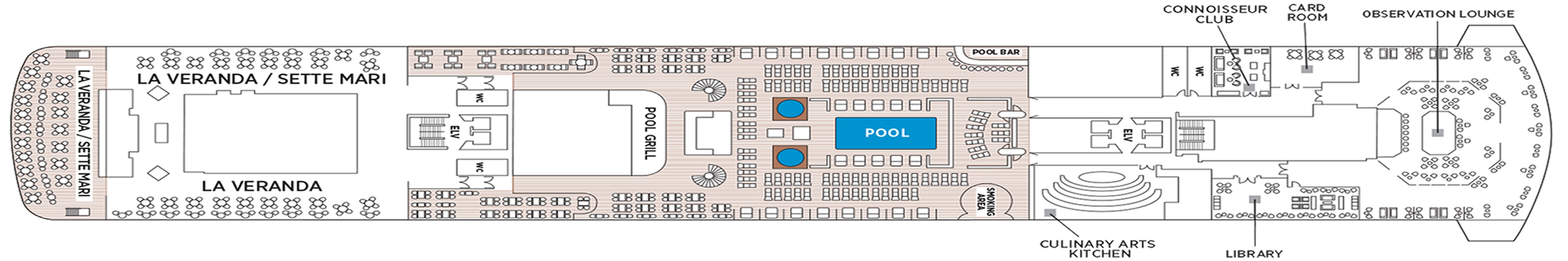 When the call of a glistening pool with an unforgettable vista beckons, head to our Pool Deck. Outfitted in teak accents which make it one of the most elegant at sea, the Pool Deck features a lavish pool and two whirlpools. You’ll also find an amiable and dedicated crew standing by to provide refreshing beverages and lounge chairs with plush towels.