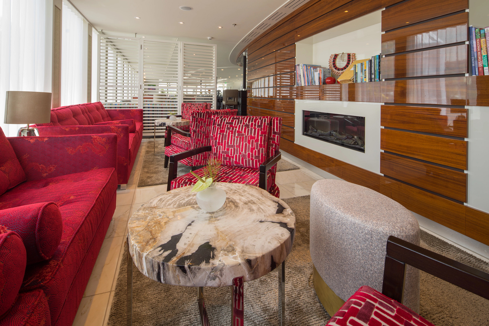 This versatile space hosts a bar, dance floor, plenty of comfortable couches and big windows on three sides and is used for everything from the morning port talks, daytime reading and chatting to scenic cruising, afternoon tea and evening entertainment.