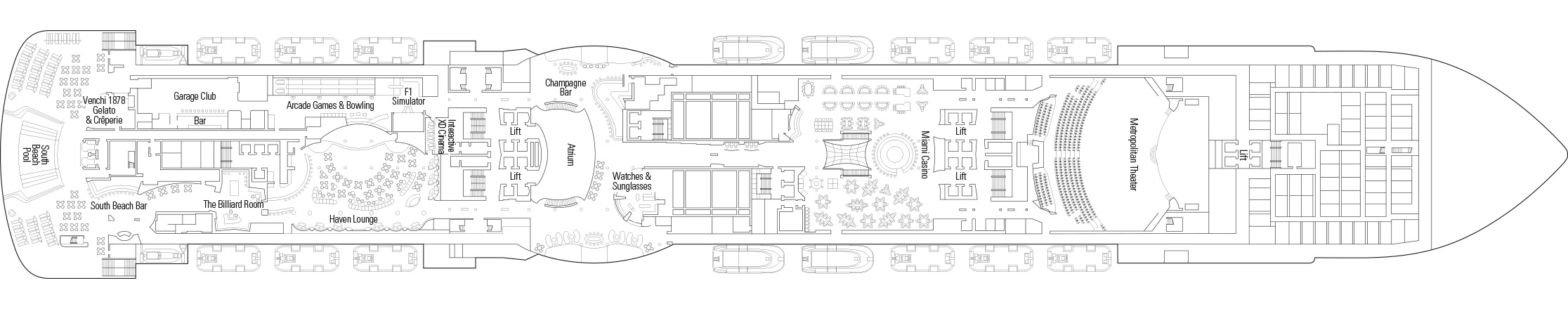 The unique Miami Beach Pool on deck 16 offers breathtaking sea views and, of course, plenty of space for sunbathing, thanks to the innovative sun loungers specially designed to give guests the chance to stay close to the pool like never before.