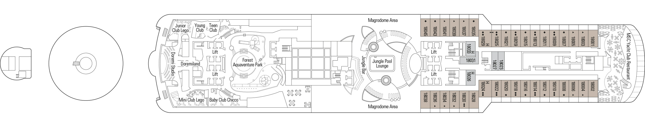 The MSC Yacht Club Sundeck & Pool is an exclusive luxurious outdoor area with captivating swimming pool, spacious sundeck, and relaxing large hot tubs for an remarkable luxury cruise experience.
