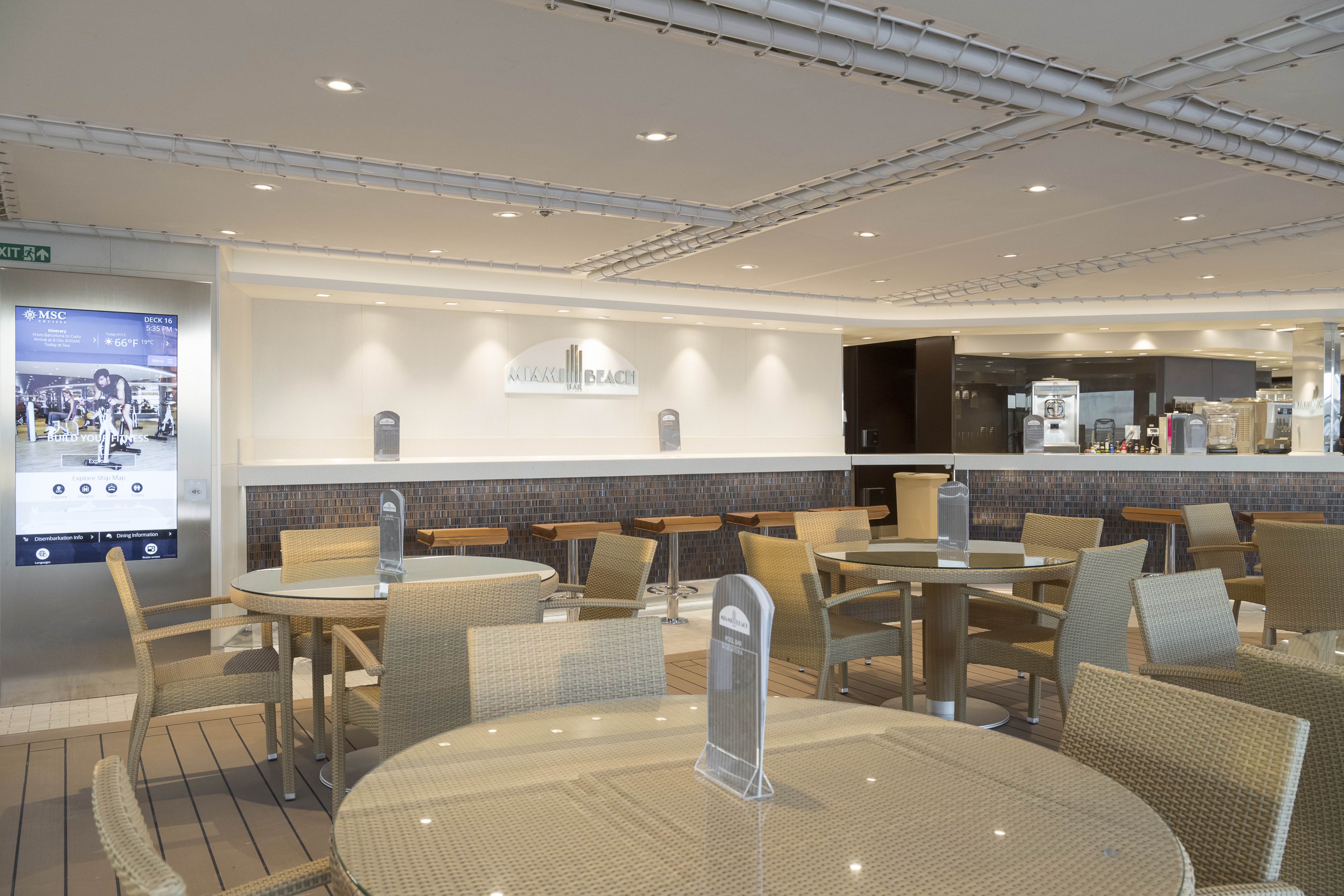 Reserved exclusively for MSC Yacht Club Guests, this elegant lounge with its panoramic views offers the Yacht Club bar list of craft cocktails, beer, fine wine, soft drinks and coffee drinks. This elegant lounge equally offers a fine selection of gourmet finger food throughout the day. Enjoy spectacular views in this elegant lounge.