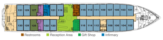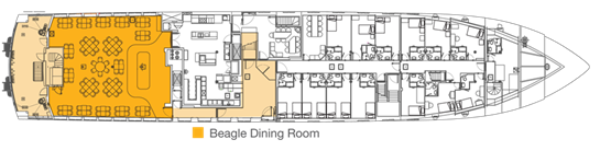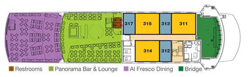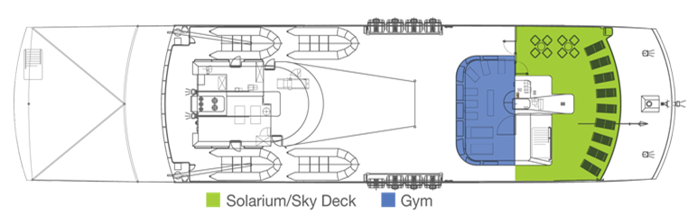 You'll enjoy the beautiful - and varied - Galápagos landscapes from the Terrace on the Panorama, home to a "Happy Hour" where snacks are served each afternoon - and you have an opportunity to visit the state-of-the-art bridge. On the Sky Deck, you'll find space to relax and enjoy your Galápagos cruise, taking in the sunshine at the very top of the vessel; the solarium / sun deck and fitness room are located here.