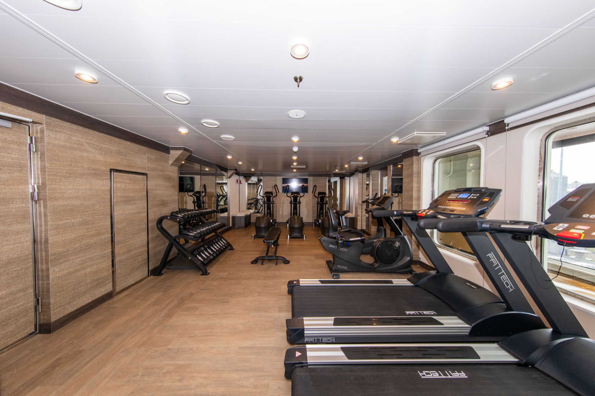 Located on Deck 7, fitness center hours are posted at the door, with facilities available on a first come, first served basis.