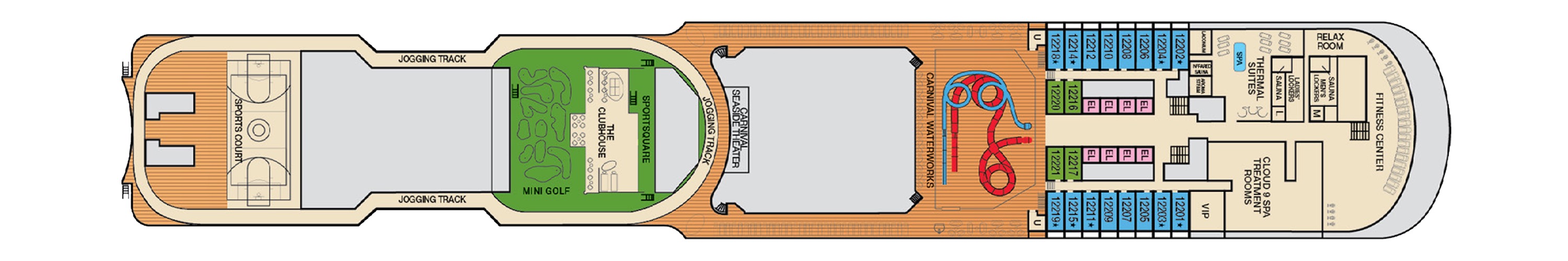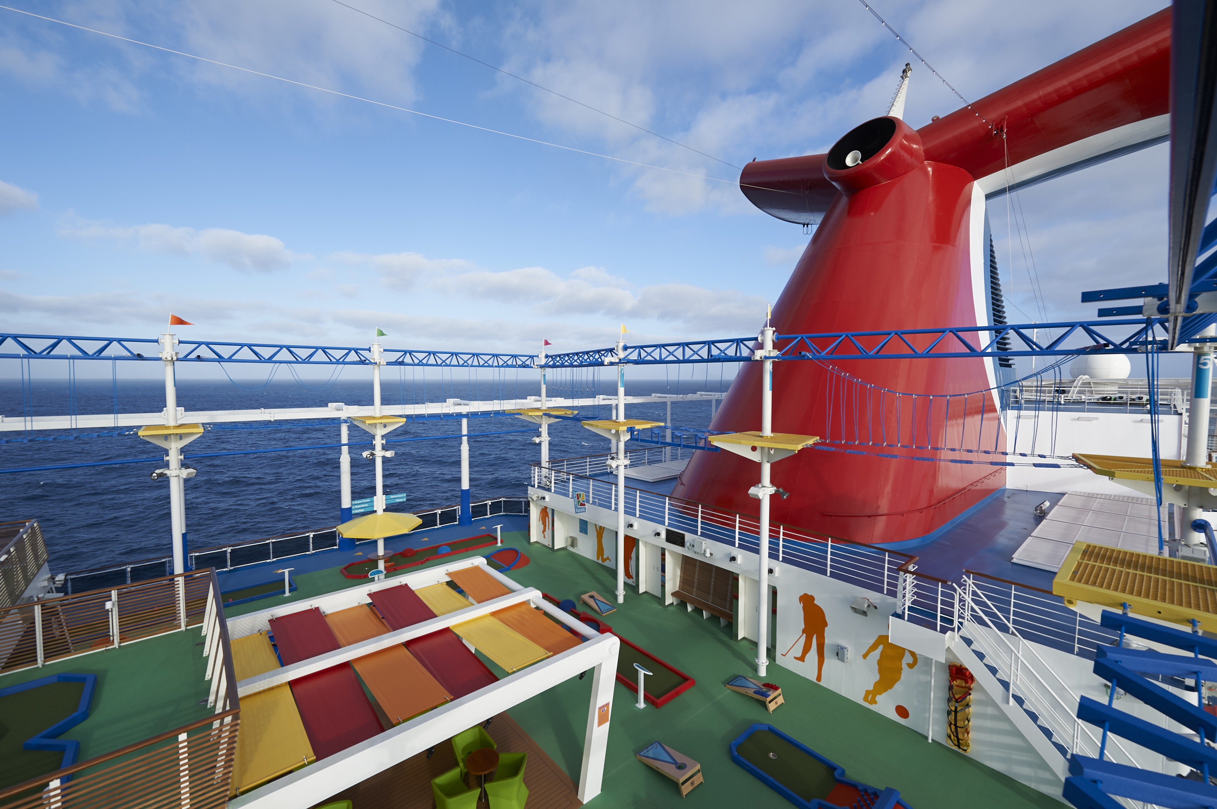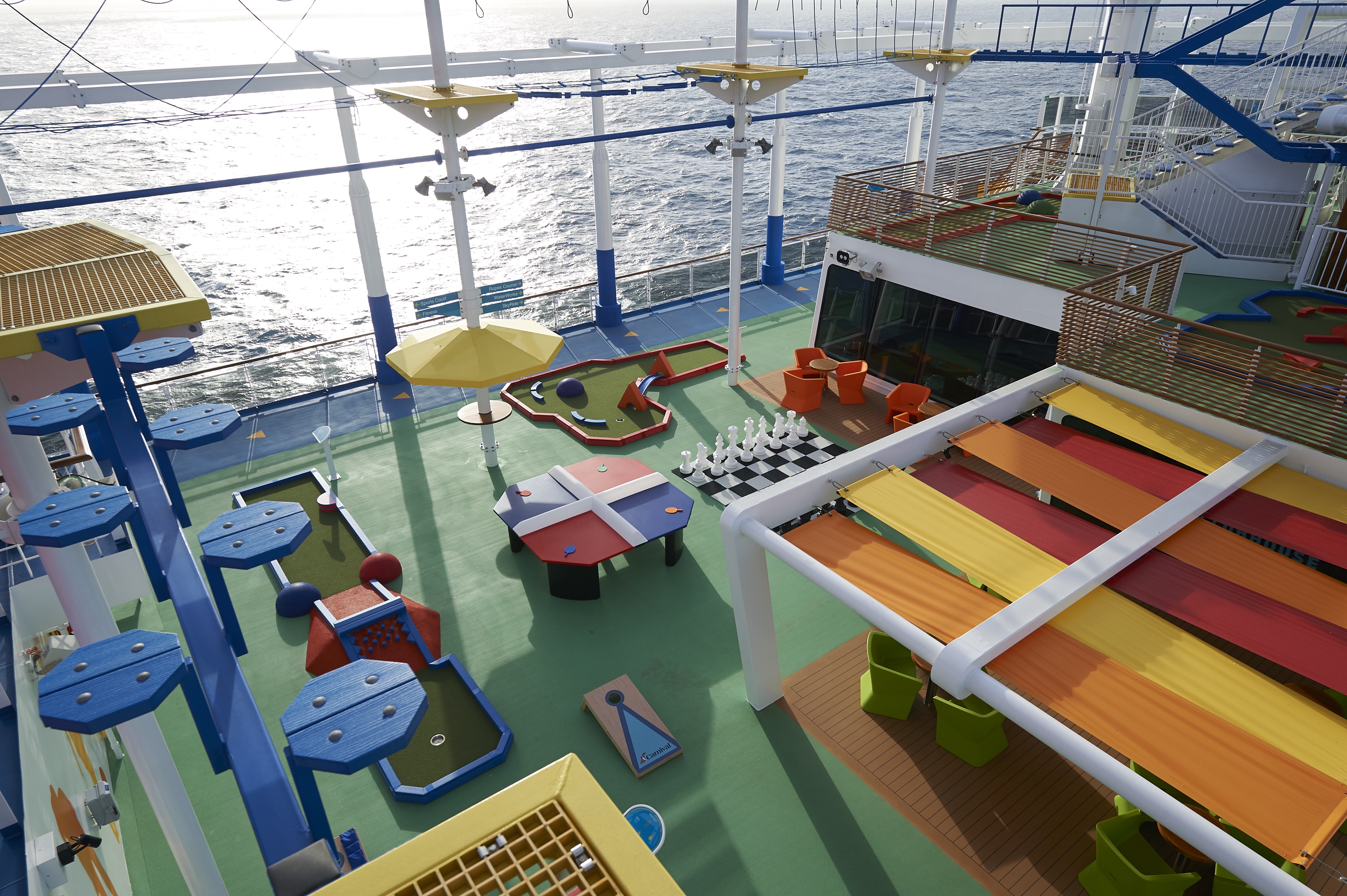 Your Carnival cruise may take you far, far away from the competitive daily rat-race, but you’ll find an oasis of friendly competition at SportSquare™. Take on friends at mini-golf, battle strangers at basketball, or push yourself to new heights at our Ropes Course... or to record-setting low times at the jogging track. SportSquare gets you in the game with soccer and volleyball (the b-ball court converts!), brings pool, foosball and ping-pong to the table, and rounds things out for shaping up with your choice of stationary bikes, elliptical machines, and weight-lifting equipment. Are you game? (SportSquare offerings vary by ship.)