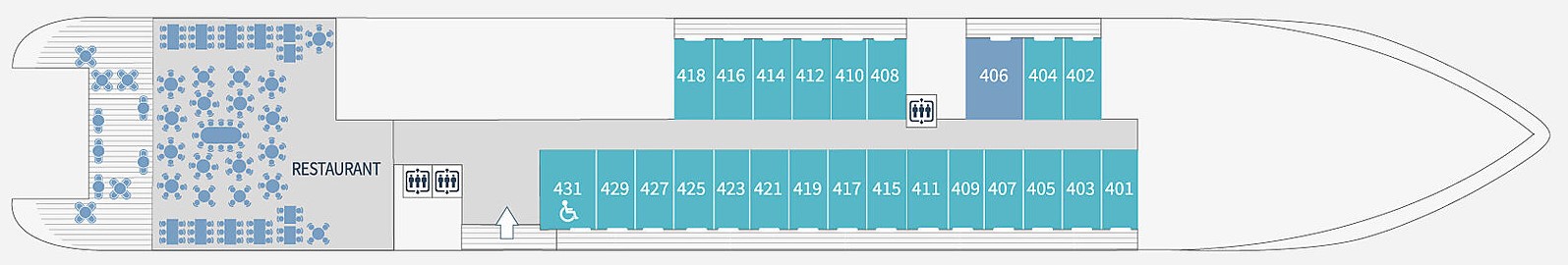 Towards the rear of deck 4 you'll find a panoramic restaurant large enough to accommodate all our passengers at one sitting. Offering a different concept than on our other ships, this space is open to the exterior and serves buffets of salads, desserts and cheeses. Our discreet and attentive staff provide a table service for hot meals.