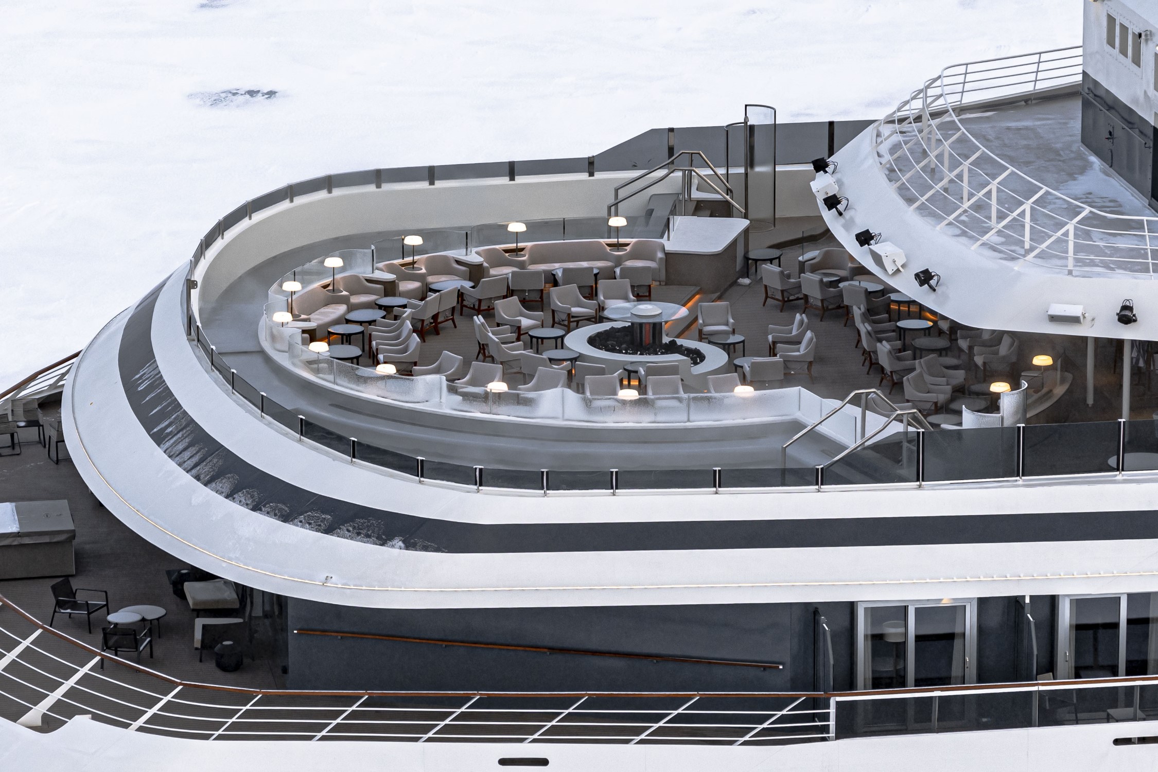The outside promenade deck is uninterrupted. This means that, unlike most passenger ships, it is possible to walk all the way around the ship and to the bow. It is also equipped with benches heated by energy recovery and two Swarovski Optik telescopes.