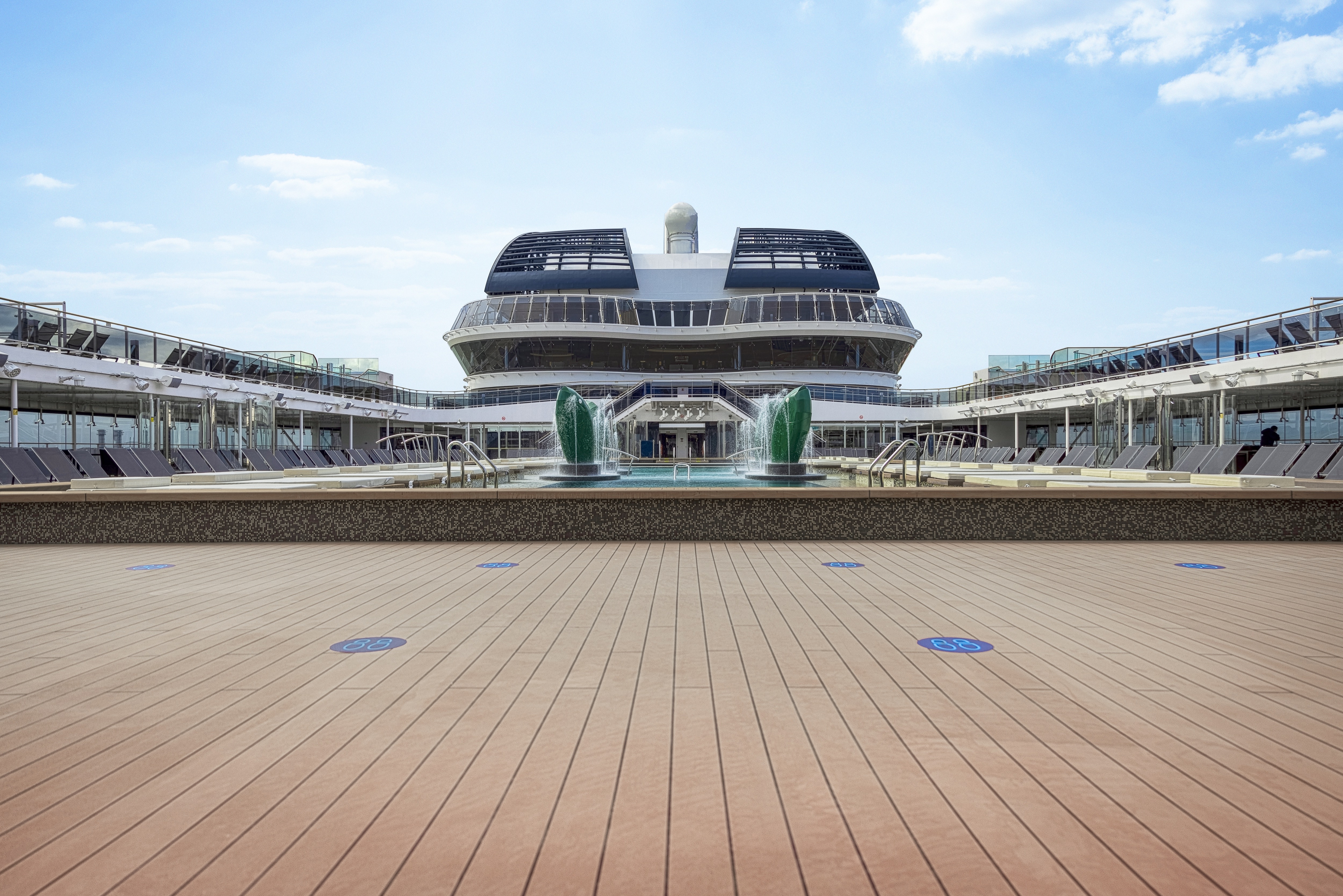 The MSC Yacht Club Sundeck & Pool is an exclusive luxurious outdoor area with captivating swimming pool, spacious sundeck, and relaxing large hot tubs for an remarkable luxury cruise experience.