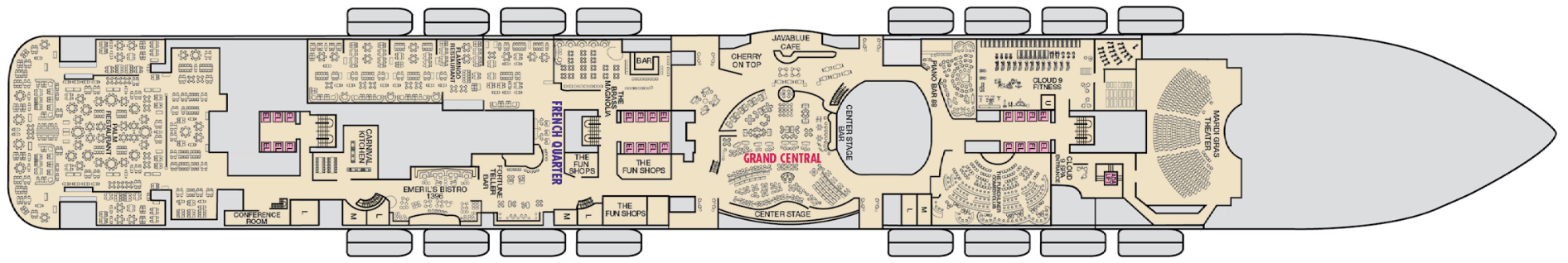 On a Carnival cruise your vacation starts in the atrium, and on Mardi Gras that’s in the Grand Central zone. By the way… on this ship the atrium’s different. Don’t be surprised if you step inside and the first place you want to look is upwards. Up there are high ceilings that hint at even more fun living on the three decks above! But look around too… you’ll find floor-to-ceiling windows that really bring in the ocean views. Of course you’ll be back here throughout your cruise, taking a break with a nice cup of coffee, enjoying live music up on stage, or killing time fabulously with a handcrafted cocktail in between evening shows. In Grand Central you’re never far from great dining spots like Bonsai Sushi and Bonsai Teppanyaki, plus feel-good entertainment like Piano Bar 88 and The Punchliner Comedy Club.