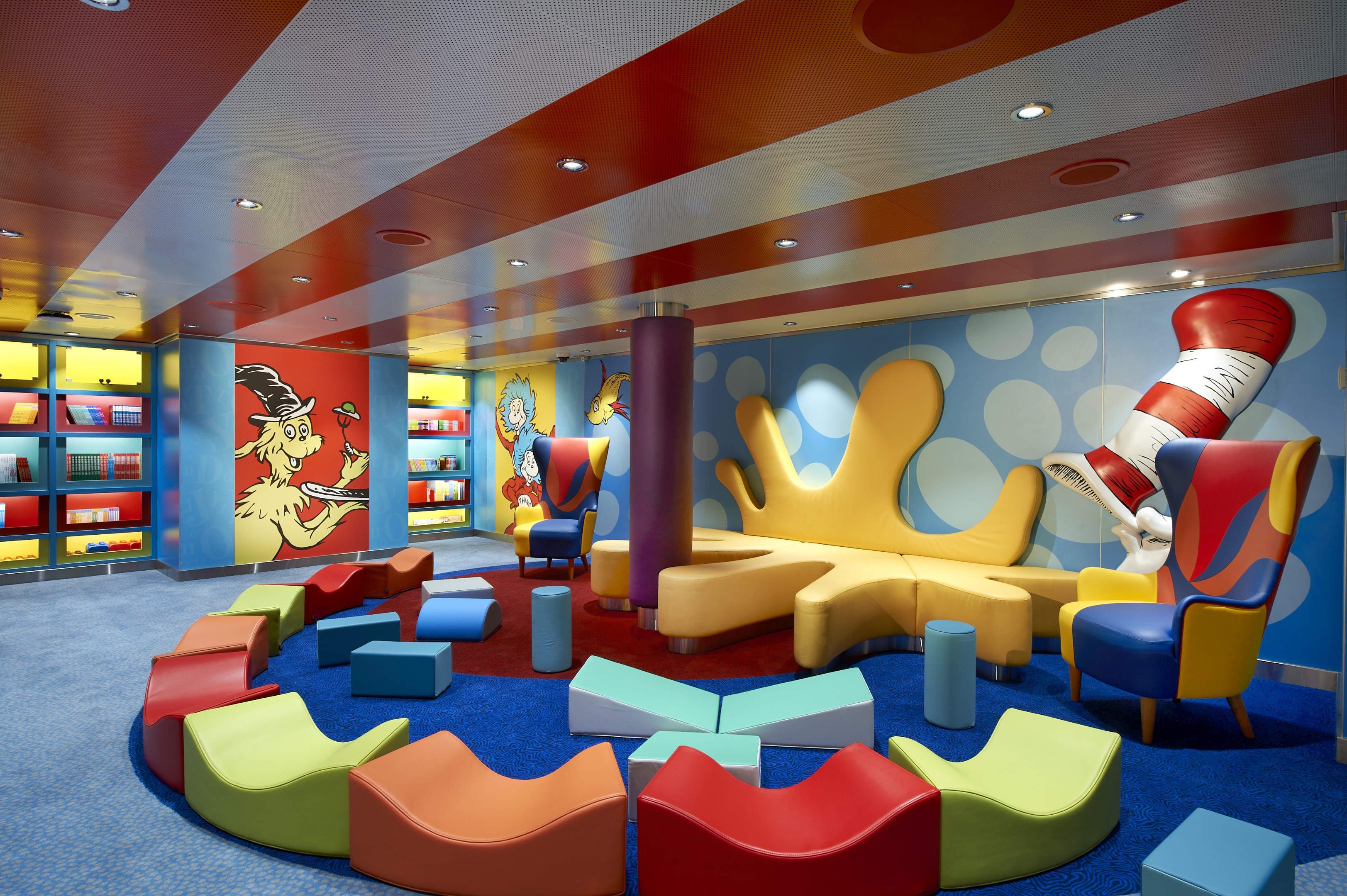 Let’s use our imaginations — just think what would happen if we took a normal library and put it through one of Dr. Seuss’s® wacky contraptions… set to maximum fun, of course. It would probably come out looking much like Dr. Seuss Bookville™, exclusively aboard Carnival! As you can imagine, the room is all decked out in bright colors and characters, featuring fun and whimsical furniture… and even has some of your all-time favorite books. The shelves are filled to the brim, but your cruise isn’t complete without unique reading events and fun interactive learning sessions featuring special character appearances and more.
