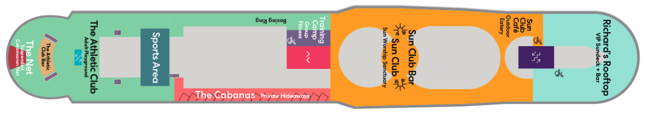 Our signature, Virgin-red running track forms a (255 meters-ish) halo-like vision over the ship, allowing you to sweat, strut or stroll. Because for some of us, the only kind of running we do is… from our problems. And don't forget the SPF — The Runway is outside and the sun, unlike our problems, will catch up with you no matter how fast you run.