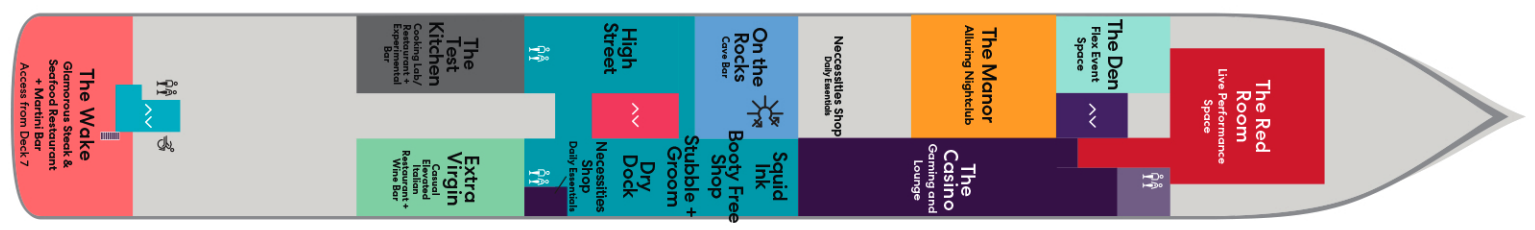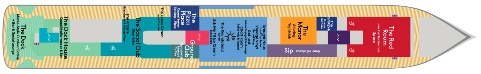 The Social Club is the perfect hangout spot for those young in spirit. The Social Club’s full retro arcade pays homage to the epic childhood video games of yesteryear – like Pacman, Mario Bros, Donkey Kong and other various vintage arcade games. Sailors can also play classic games like air hockey, bar-top shuffleboard, foosball and board games. Yup - you’ve guessed it’s all included. The Social Club is also home to The Social Club Diner where Sailors can grab classic carnival bites, and The Loose Cannon, our nautically themed cozy seaside drinkery. Inner children are permitted to run wild here.