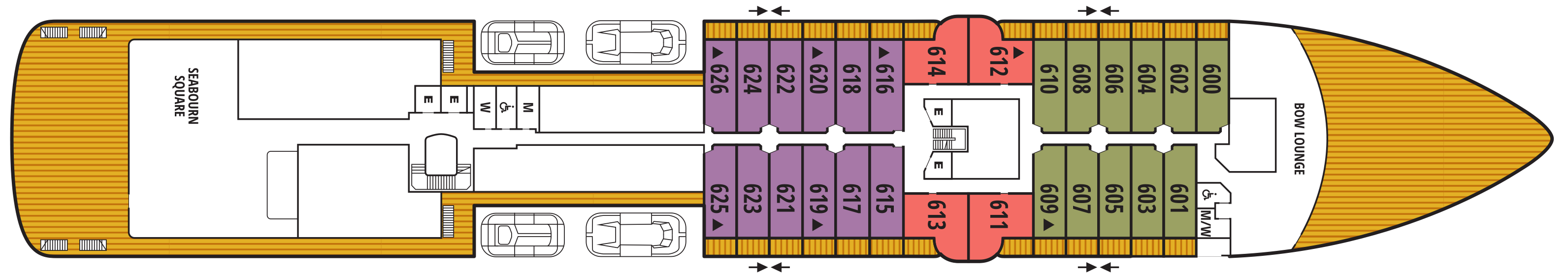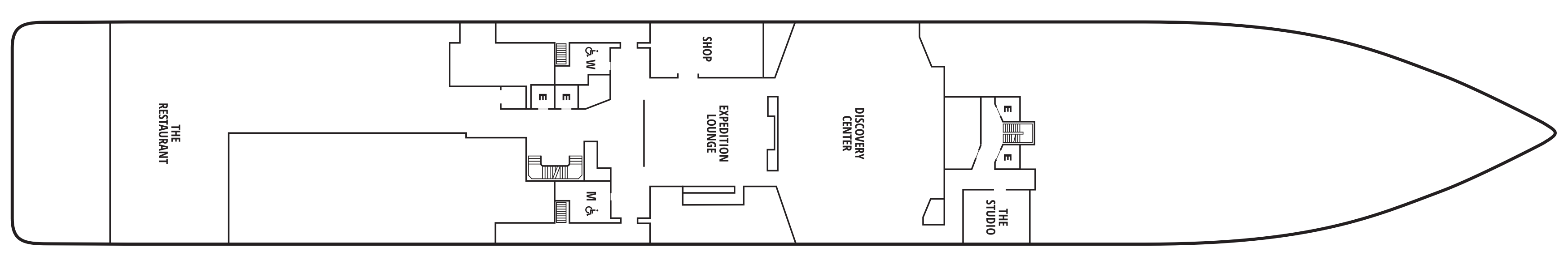 The space provides direct access to the Bow Sprit on Deck 6 forward (when conditions permit) to give guests the sensation of standing in front of the ship and views of waves parting and ice sloughing off the bow at the waterline.