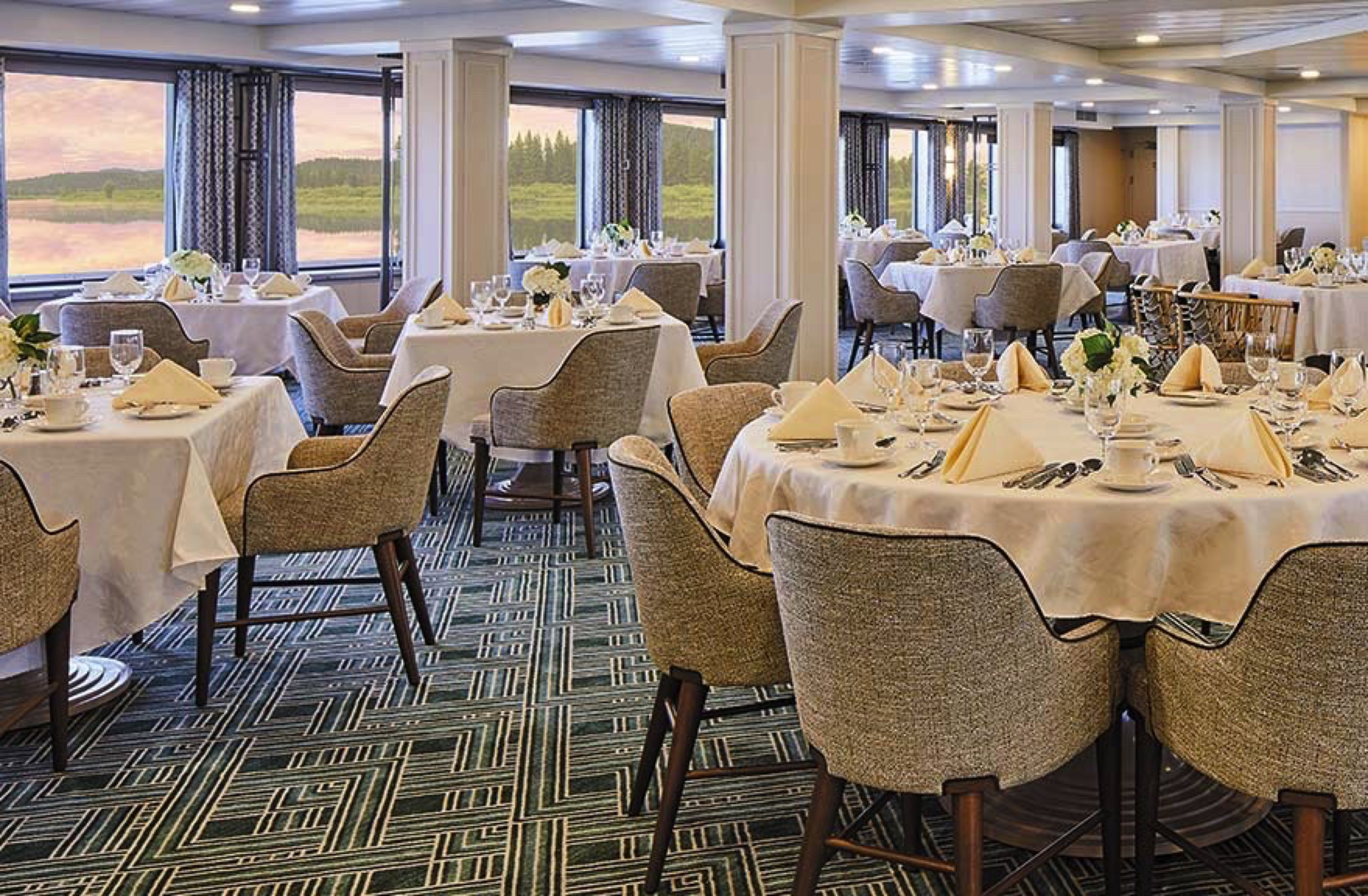 Indulge in the finest cuisine at our glass-enclosed restaurant, where you can enjoy the panoramic views of the spectacular scenery that defines every American Cruise Lines journey. Each menu showcases American specialties crafted from locally sourced ingredients, ensuring a fresh and flavorful dining experience. With ample seating available, all guests can enjoy their meals together in comfort and style.