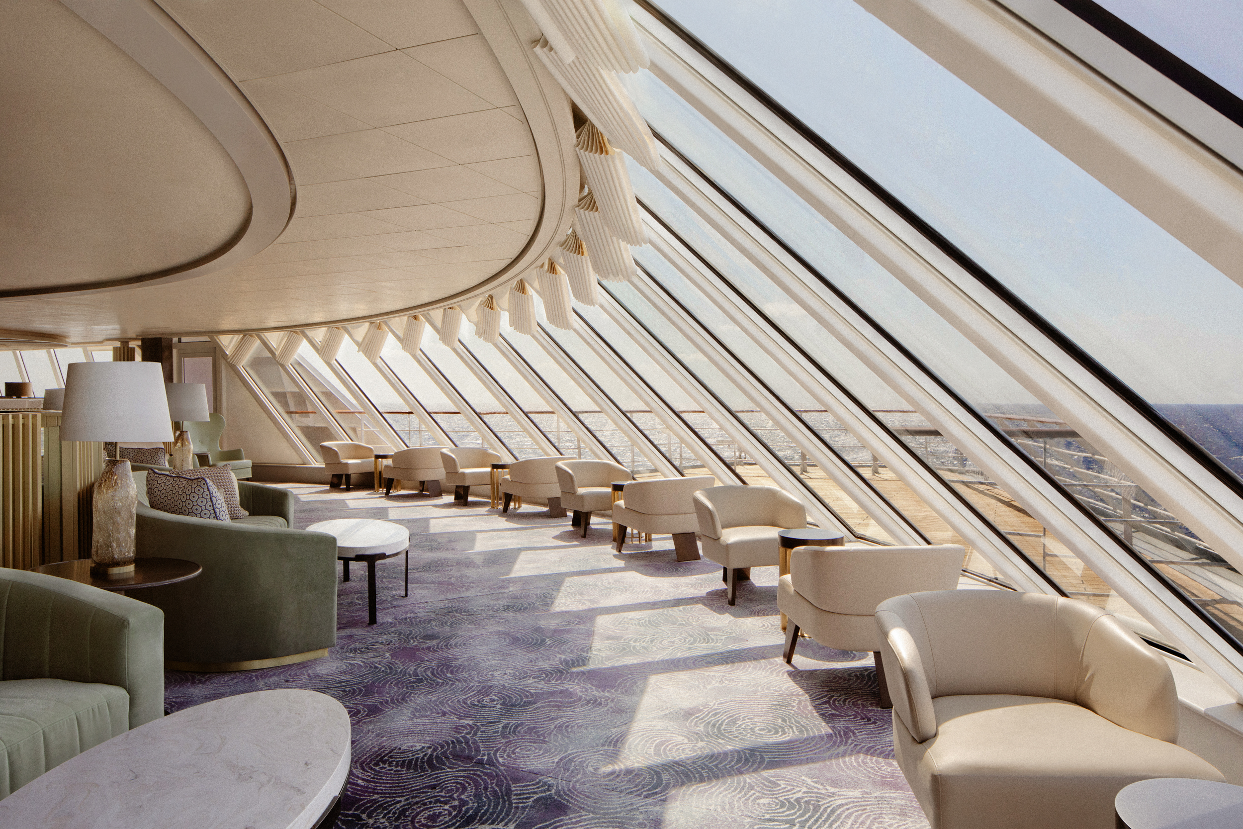 Buffet style dining wrapped in floor to ceiling windows and a chic open air dining area. This venue offers breakfast and lunch with a variety of choices from appetizers to desserts. Itinerary driven food selections keep the menu’s fresh, while carving stations and individual a la minute cooking add a dynamic element. Open seating.