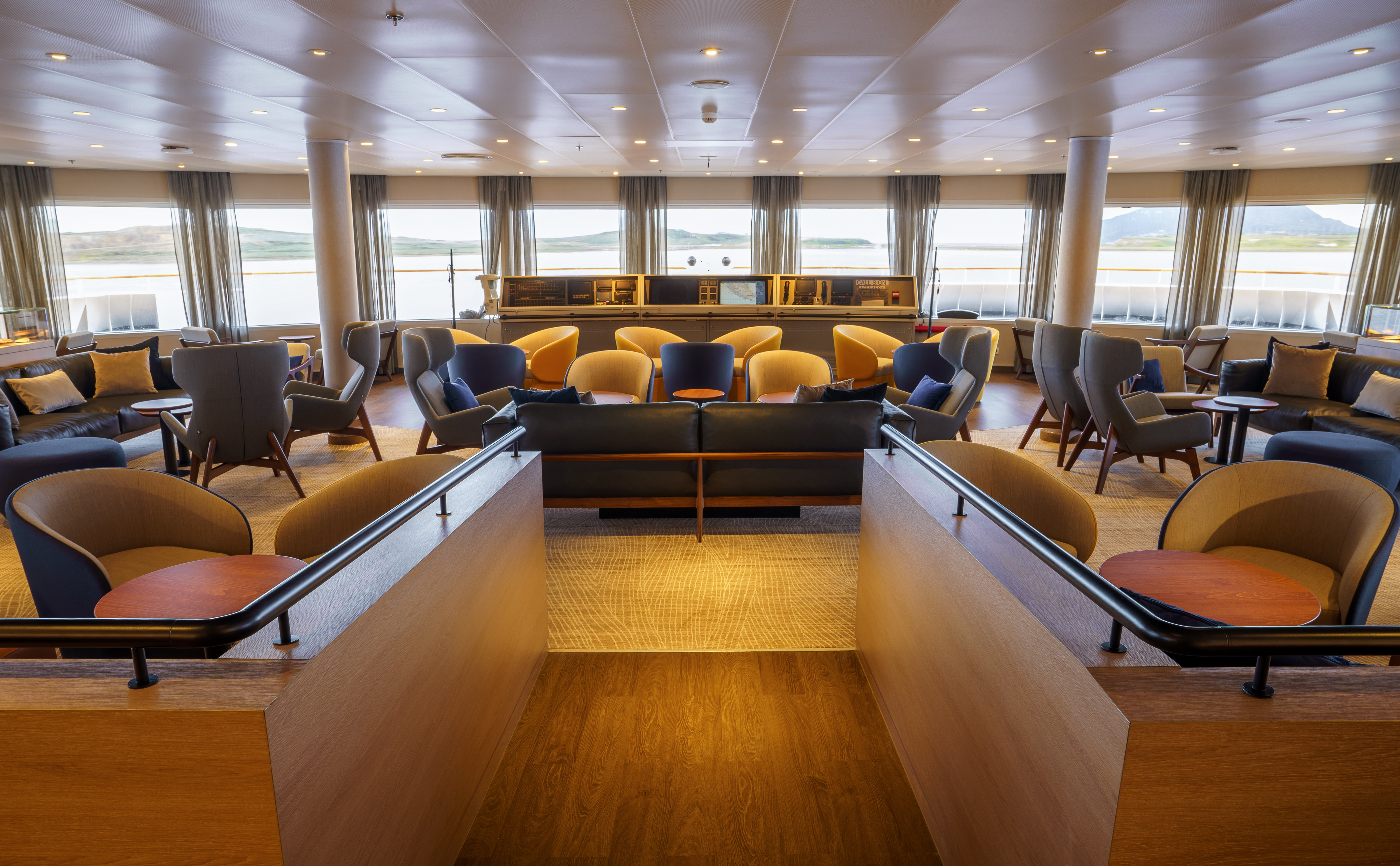 Enclosed in glass and featuring unobstructed views, the Panorama Lounge and Bar allows guests to relax indoors while staying connected to the awe-inspiring landscapes drifting by. It serves as a cozy gathering point where guests can sip a glass of wine, engage in great conversation, indulge in a board game, or socialize at the bar—and, later in the evening, bust a move on the dance floor.