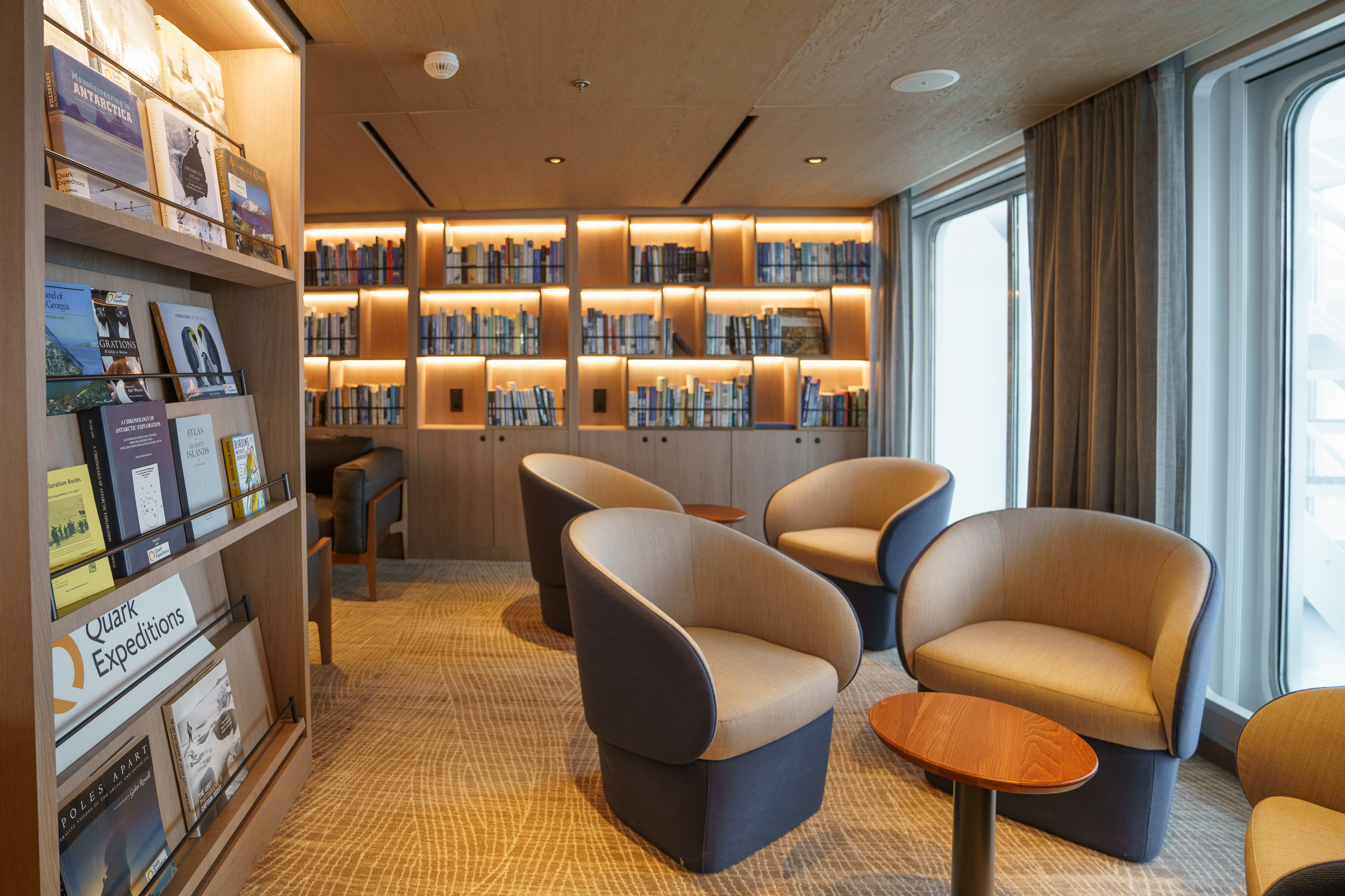 Located on Deck 7, the library offers a large collection of field guides, picture books and reference books, and also includes a selection of games for your entertainment. The Ultramarine collection includes books in multiple languages covering subjects like wildlife, history, marine biology, ecology and geology.