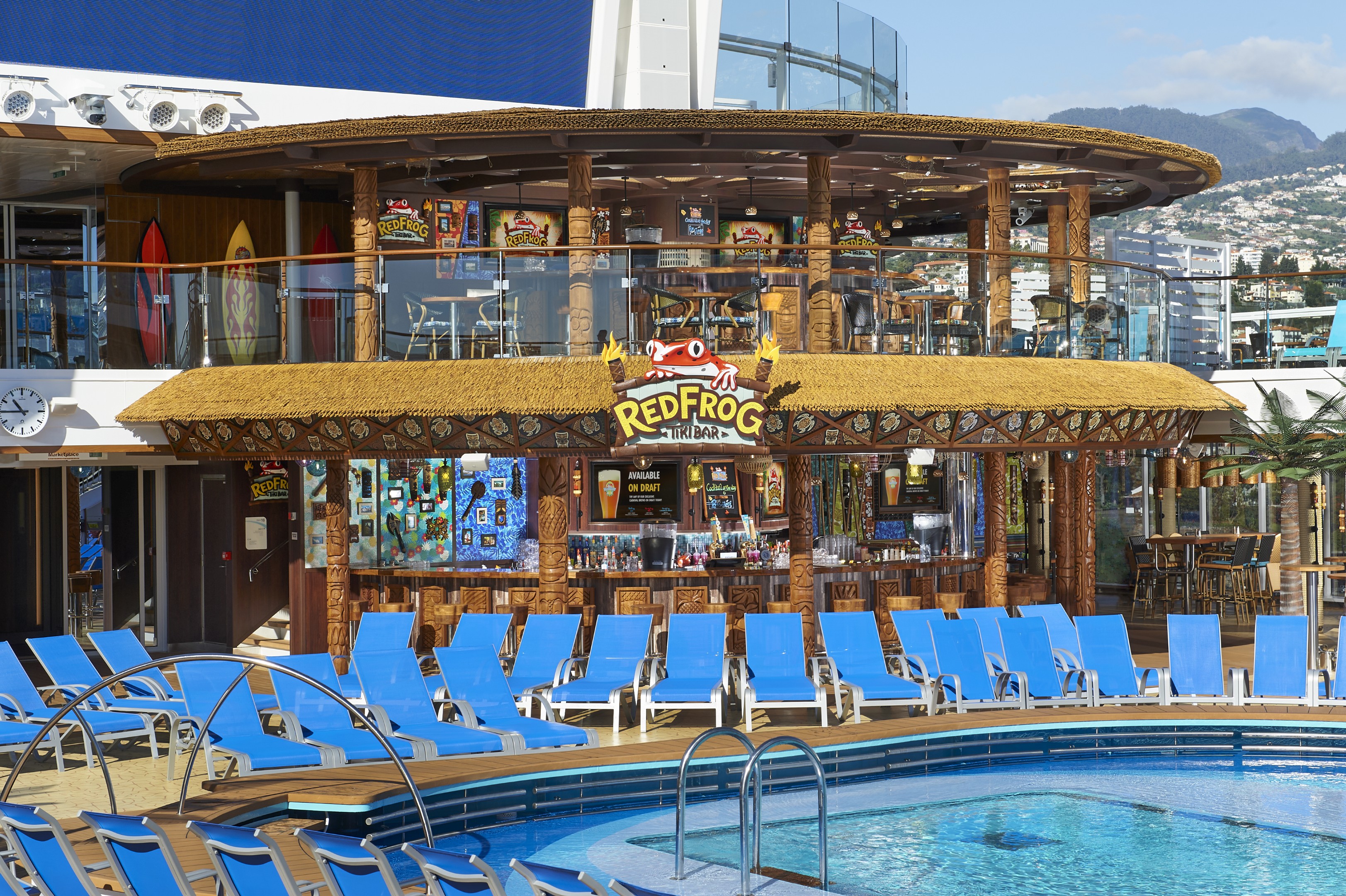 Let’s recap what we know about the mysterious RedFrog so far. He’s definitely cute, he knows how to chill… and flavor is everything to the little guy. But we only just found out about the years he spent soaking up the sun among the grass skirts and frangipani flowers of the South Pacific where, he would tell you, it’s easy being red. Some of his favorite recipes from those days form the core of the menu at the first-ever RedFrog® Tiki Bar — sip a Polynesian Punch, try a Jungle Bird, or get a little tongue-twisted ordering a Red’s Rum Jumper. This poolside bar actually spans two decks and, no matter where you’re sailing, can be counted on to transport you right to the land of Tiki.