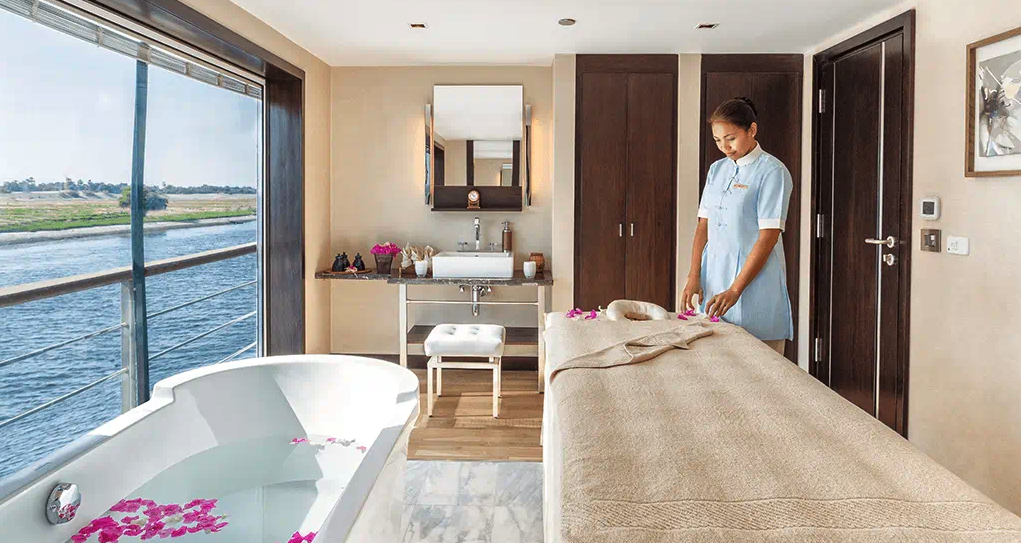 Whether vou want to work out at the onboard fitness center or sit back and enjoy one of the many spa amenities, Oberoi Philae has it all... take some time for an Oberoi massage with a Nile view... or maybe, take advantage of the unisex beauty salon. Join a therapist as they impart wellness to help reduce stress, revitalize skin and promote relaxation or indulge in holistic treatments popular in Southeast Asia