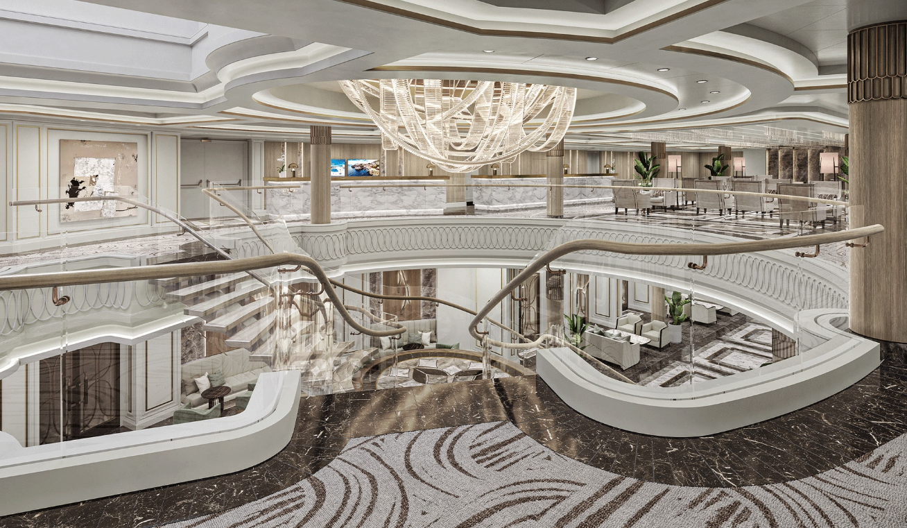 Simply put, the Atrium is the very heart of Seven Seas Grandeur™. With a magnificent chandelier above, the grand staircase descends to Compass Rose, our signature restaurant, creating a grand entrance.