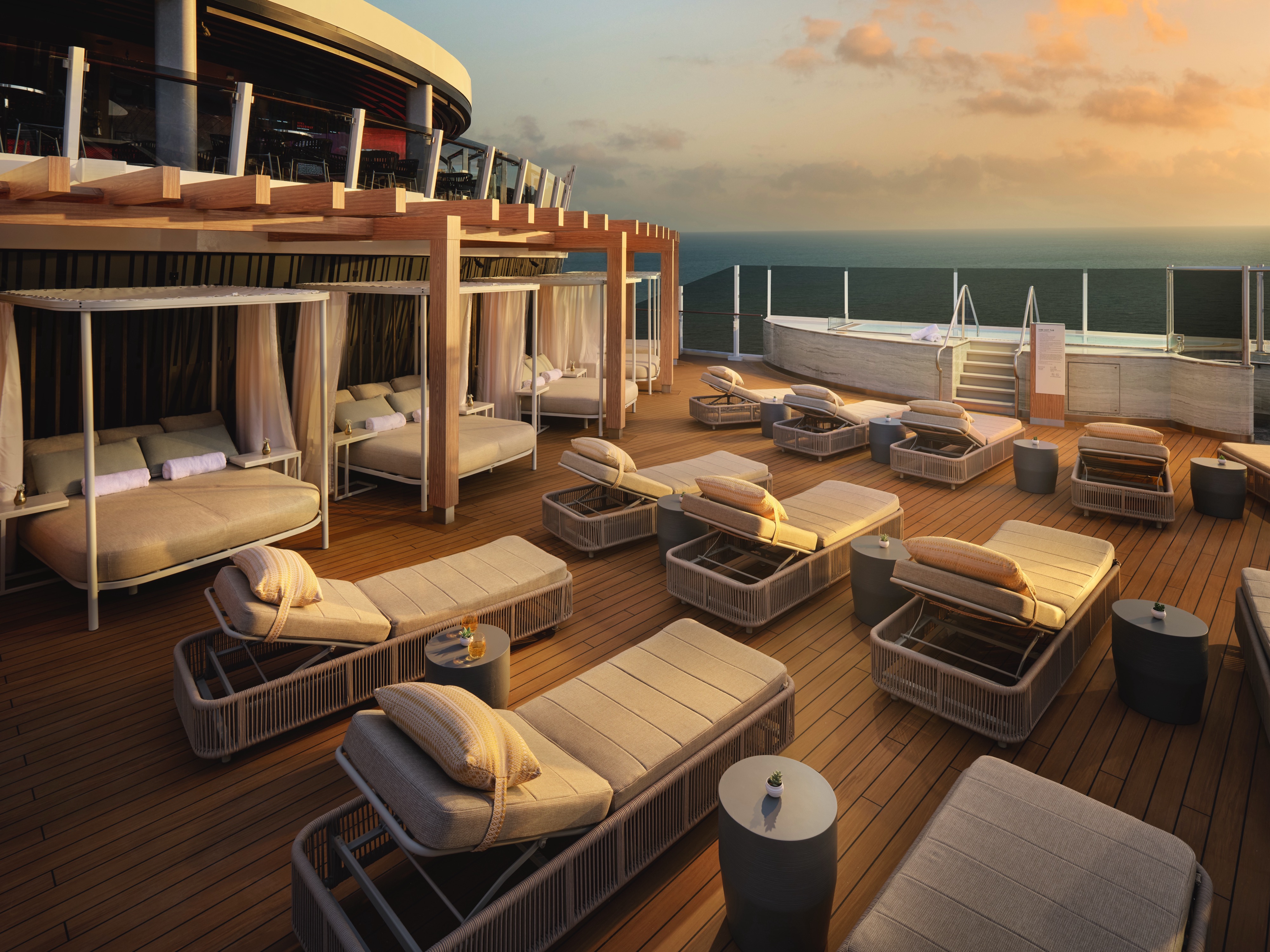 Your exclusive, adults-only retreat at the top of the ship is even more peaceful with your own space. With this package, you'll enjoy Vibe Beach Club from the comfort of a private cabana for the entire length of your cruise. Spend the day relaxing in style with special food & drink menus and complimentary amenities such as water spritzers, chilled towels and skewers of fruit.