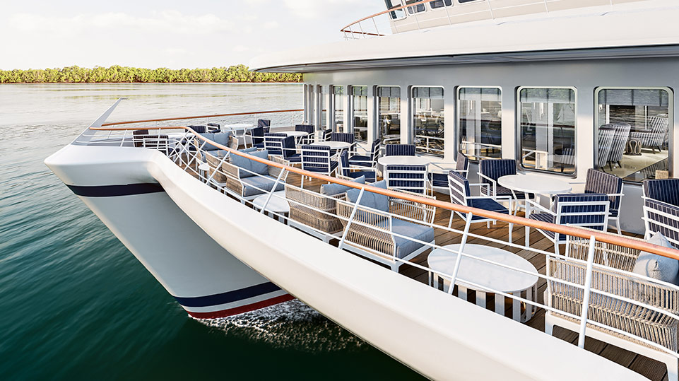 American Glory blends the best qualities of expedition adventure cruising with the refinement, luxury, stability, and land proximity of river cruising. Observation and sitting areas will be available at the bow, while a unique Swim/Activity Platform at the stern of the ship features kayaks and a tender for local exploration. The shallow draft of the vessels allow rare access into small ports and ability to travel on almost any river or waterway.