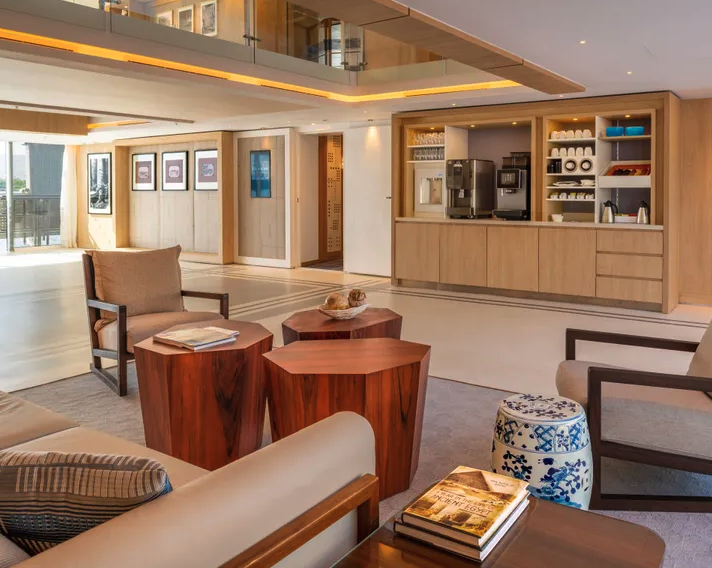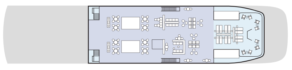 With floor-to-ceiling glass windows and large, comfortable chairs, the Lounge is the heart of the ship—a gathering place for guests to view the scenery, have a drink, take in lectures and lore, and enjoy local music.