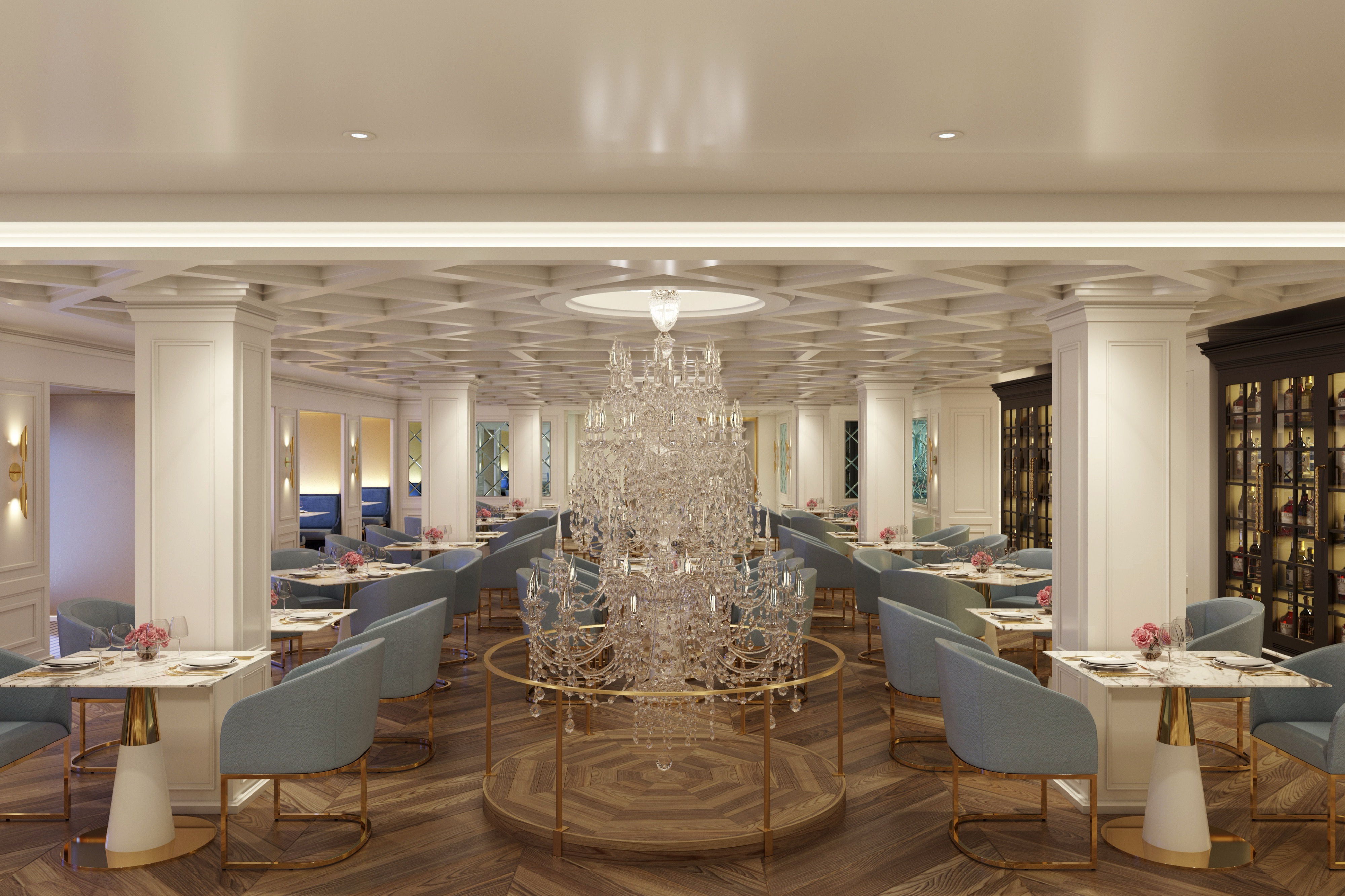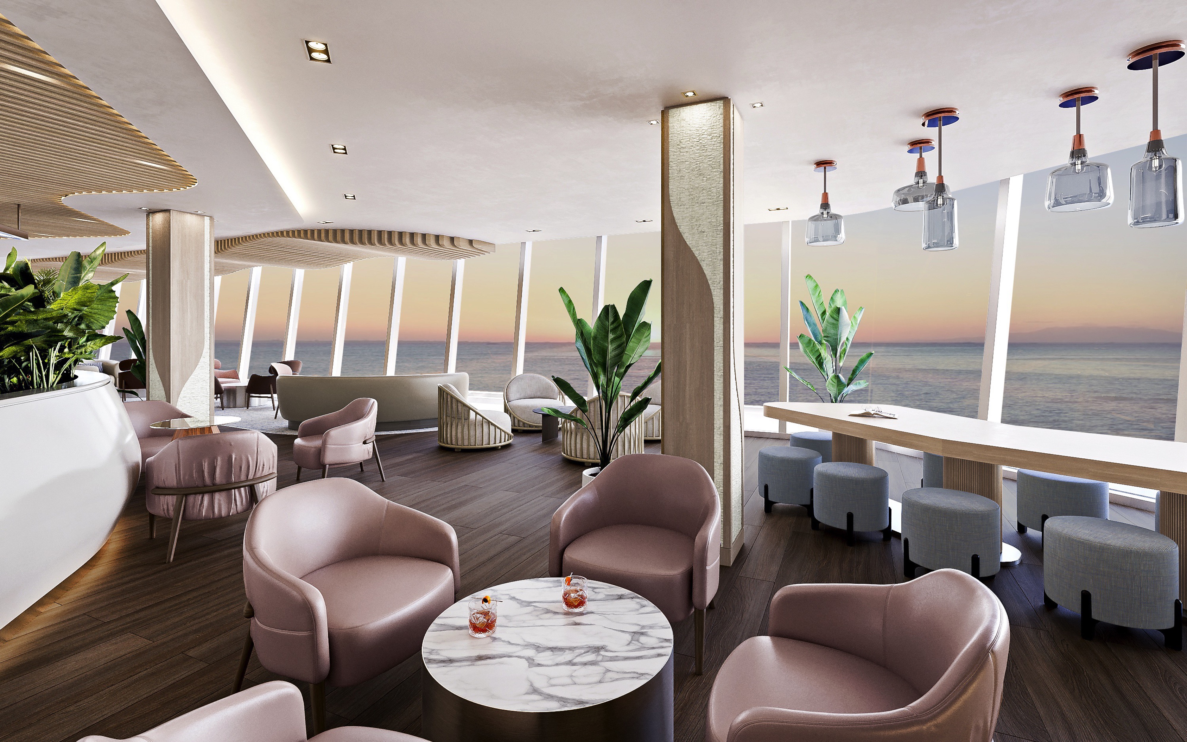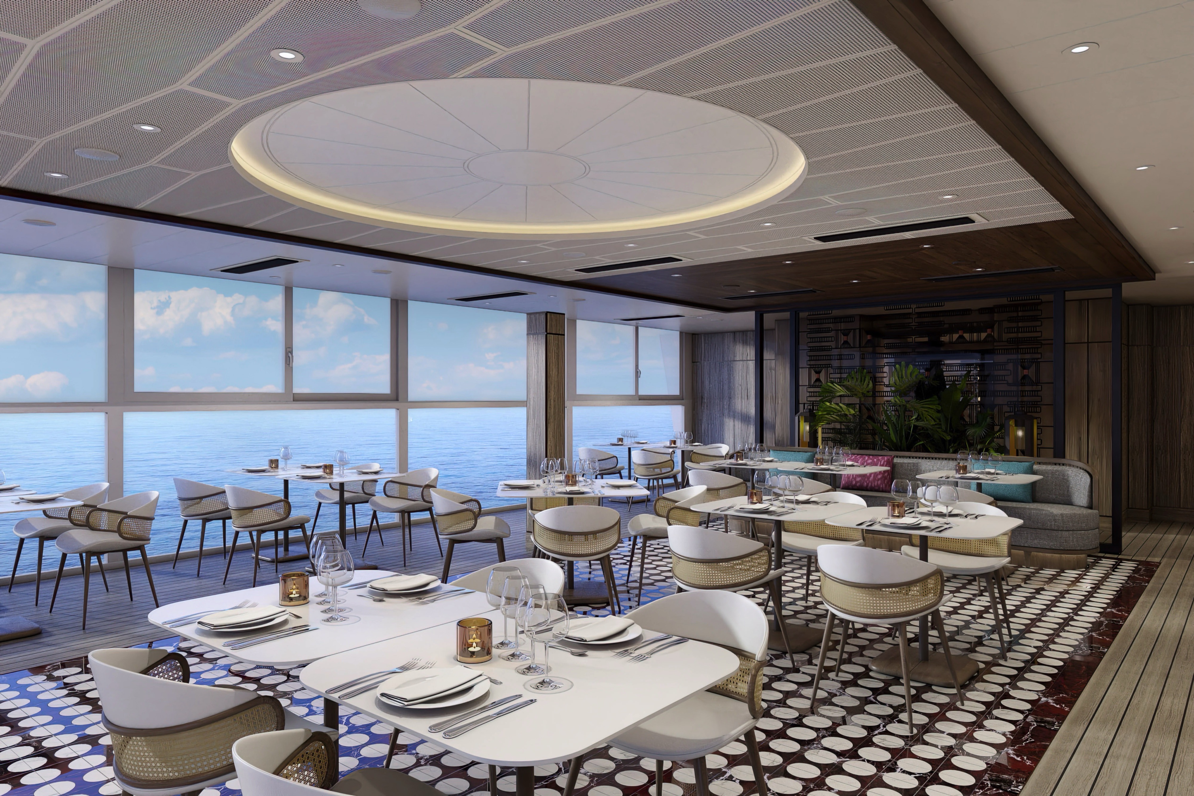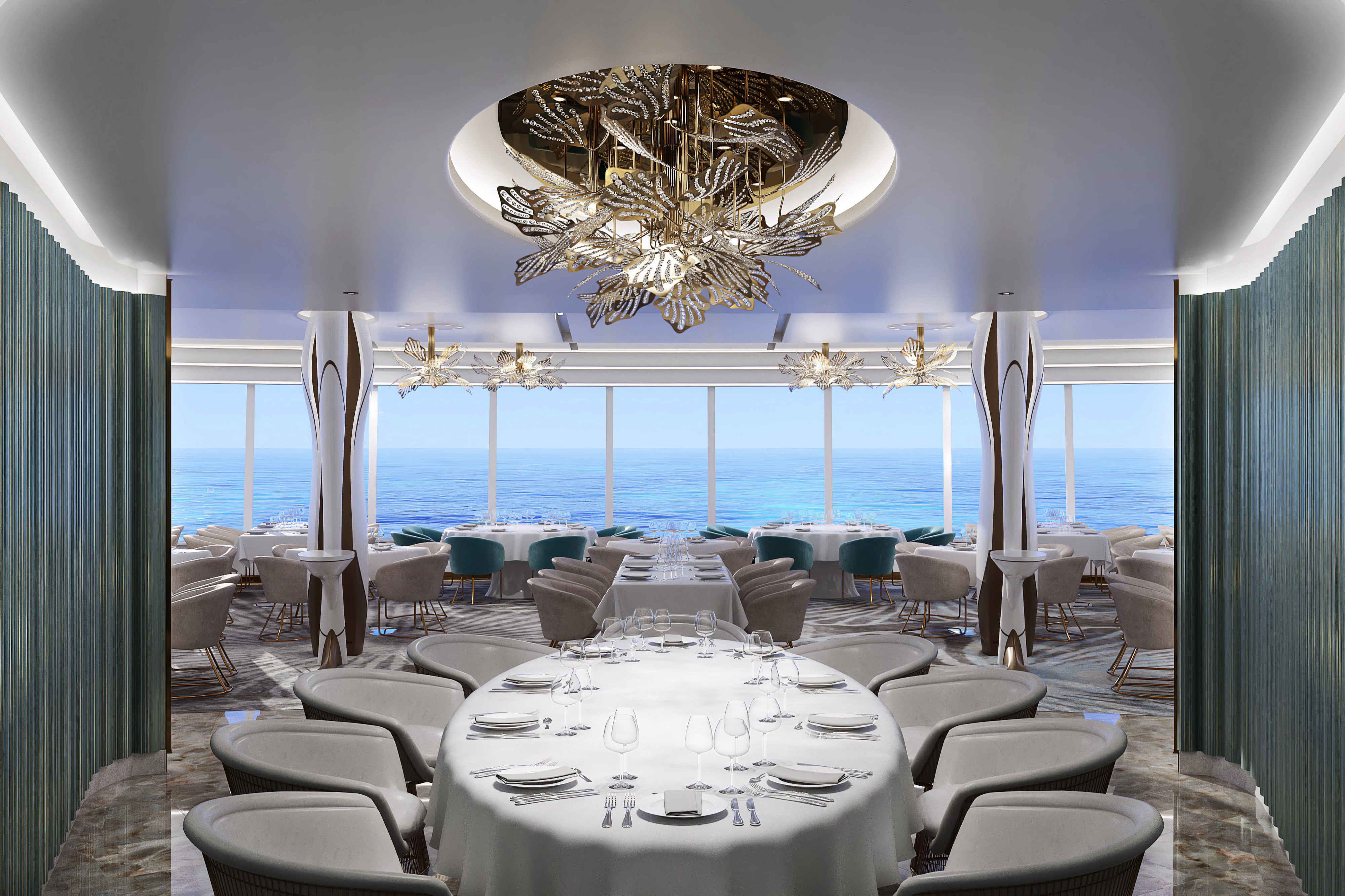 Designed to blend both indoor and outdoor experiences with stunning views of the ocean through grandiose floor-to-ceiling windows for panoramic views from the ship’s bow.