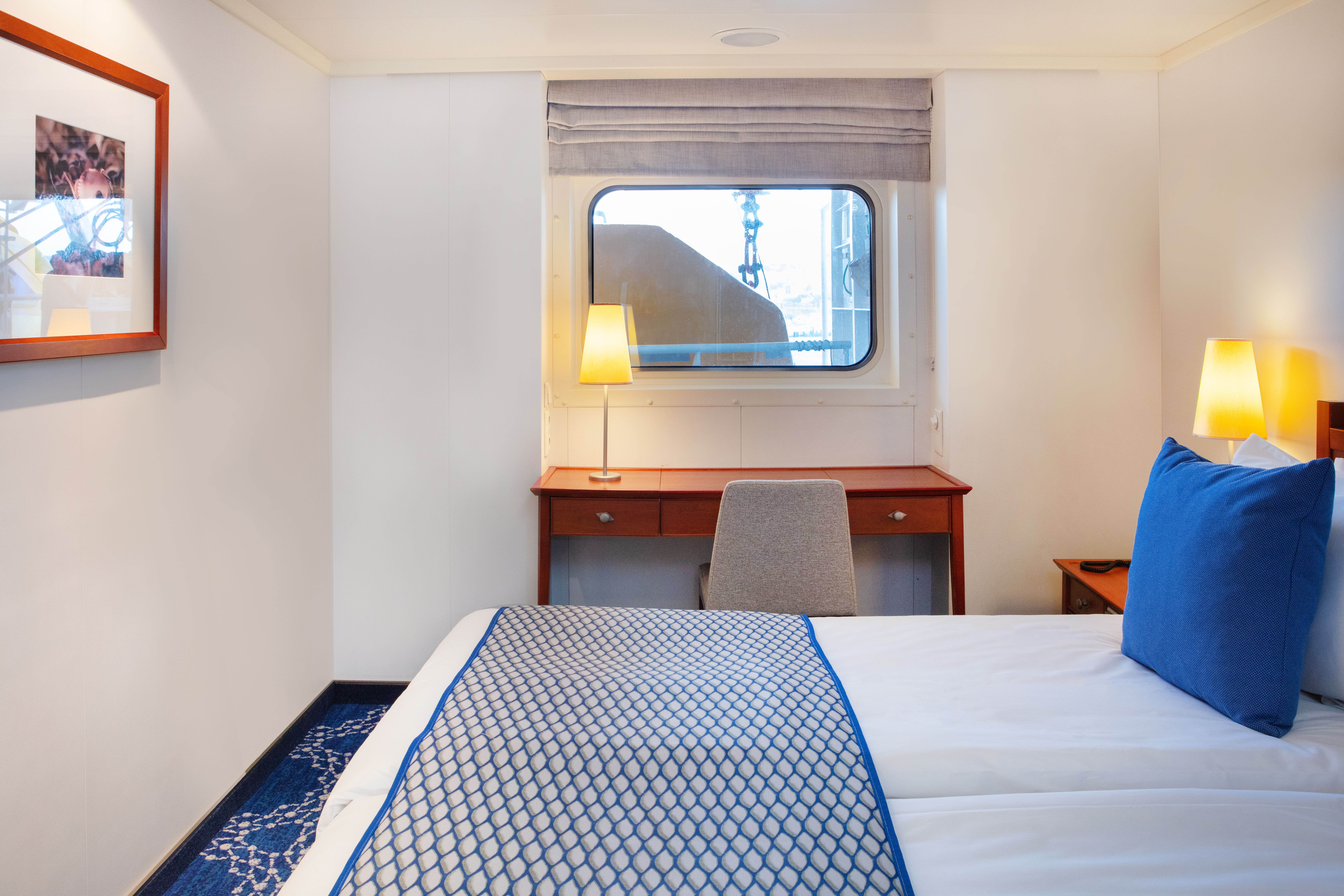 She offers 633 staterooms, 62 of which feature balconies, in total accommodating up to 1,266 guests.
