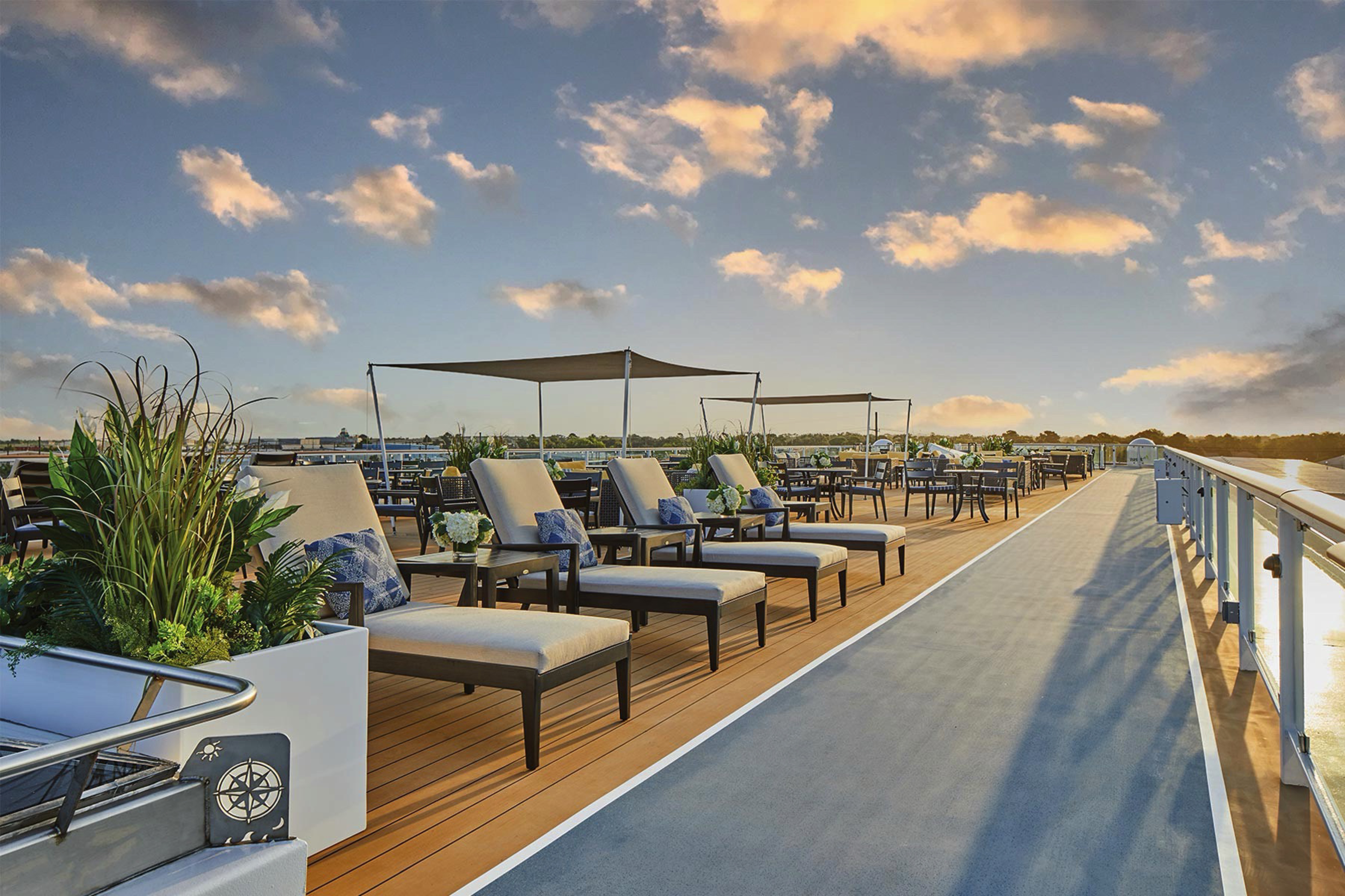 Take a deep breath of fresh air and immerse yourself in the breathtaking 360-degree view of the passing scenery from this ideal setting. Savor the gentle breeze and scenic views while reclining on a comfortable lounge chair. Unwind with your favorite book, socialize with fellow travelers, play shuffleboard, or simply bask in the serenity of your surroundings.