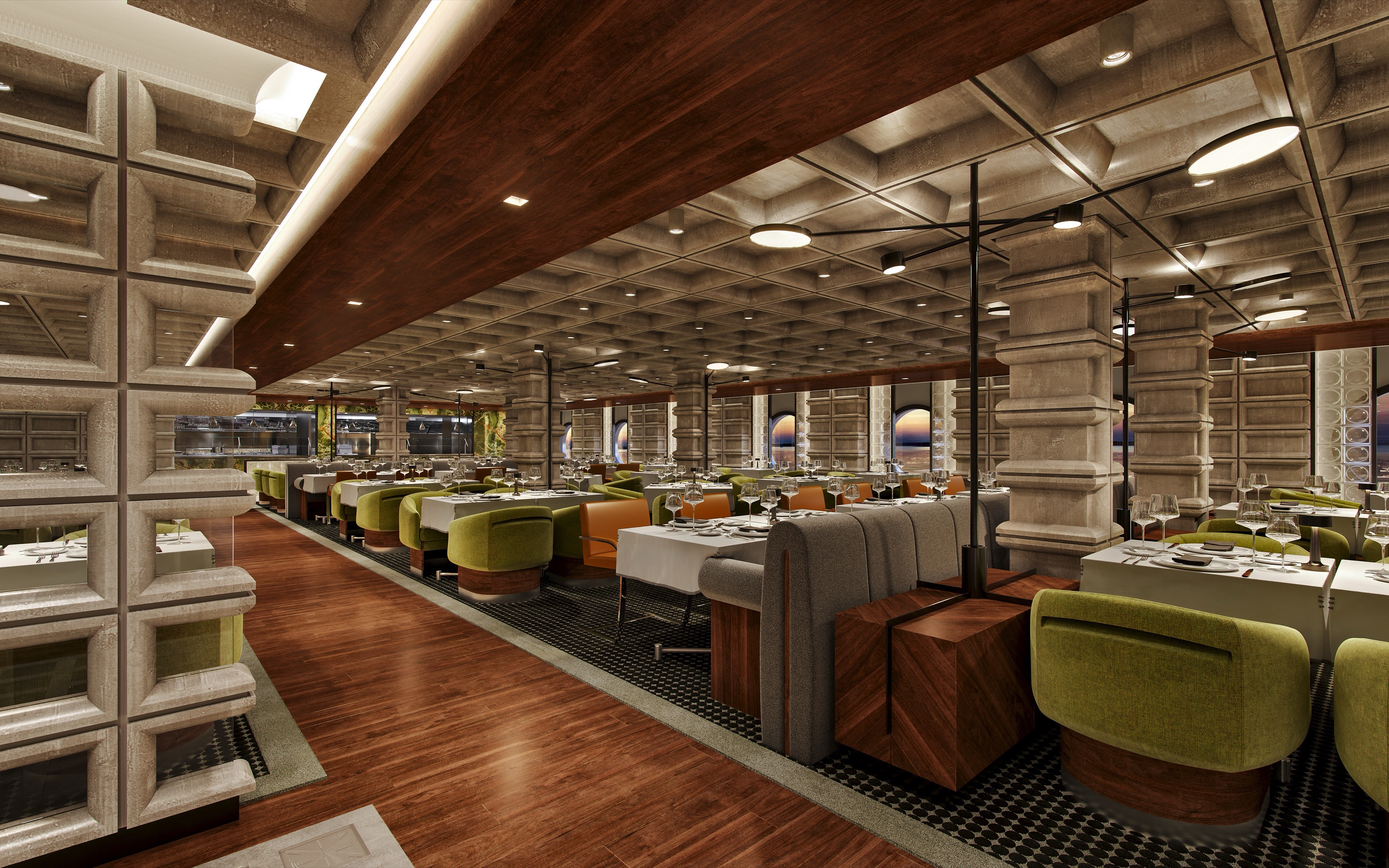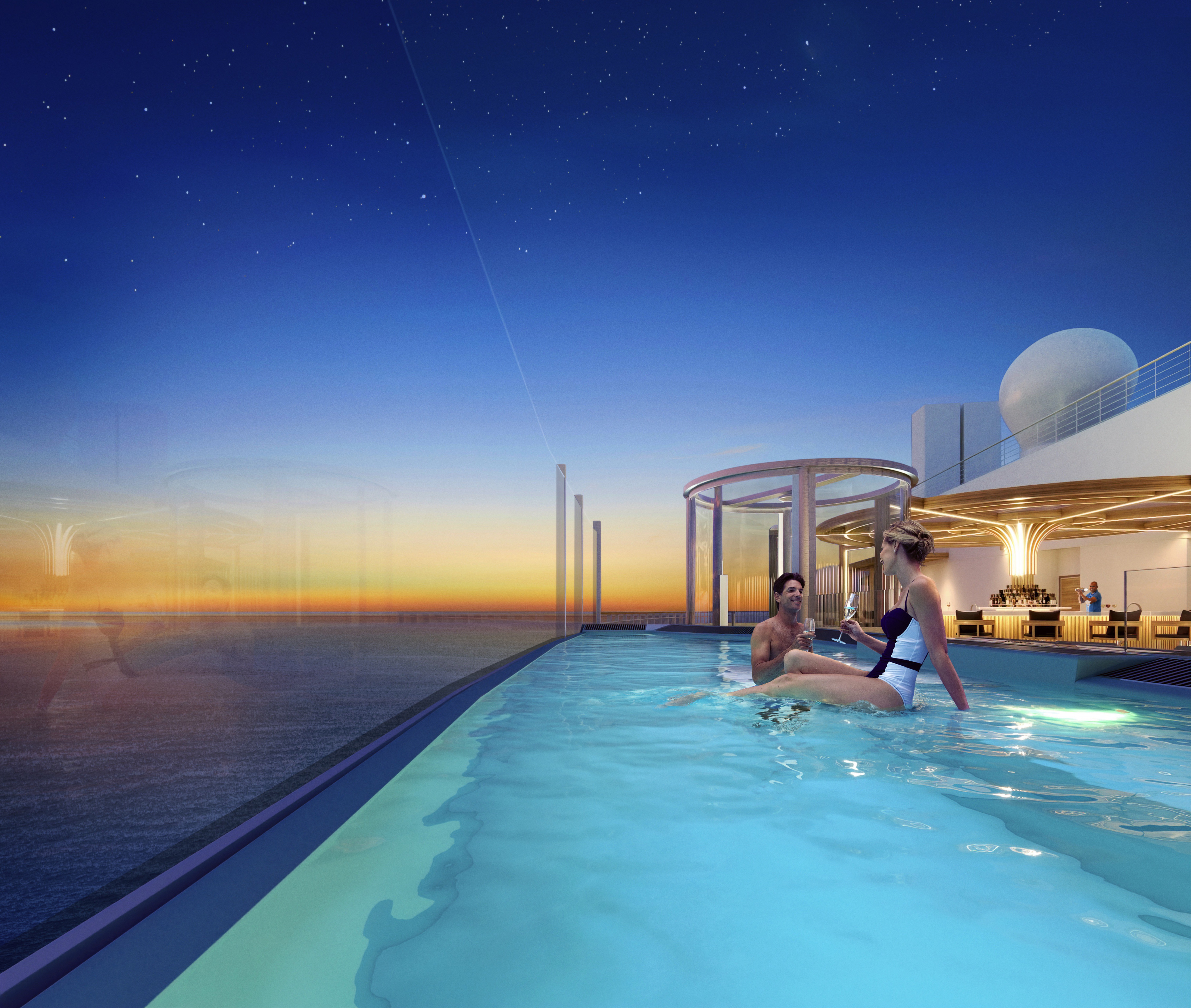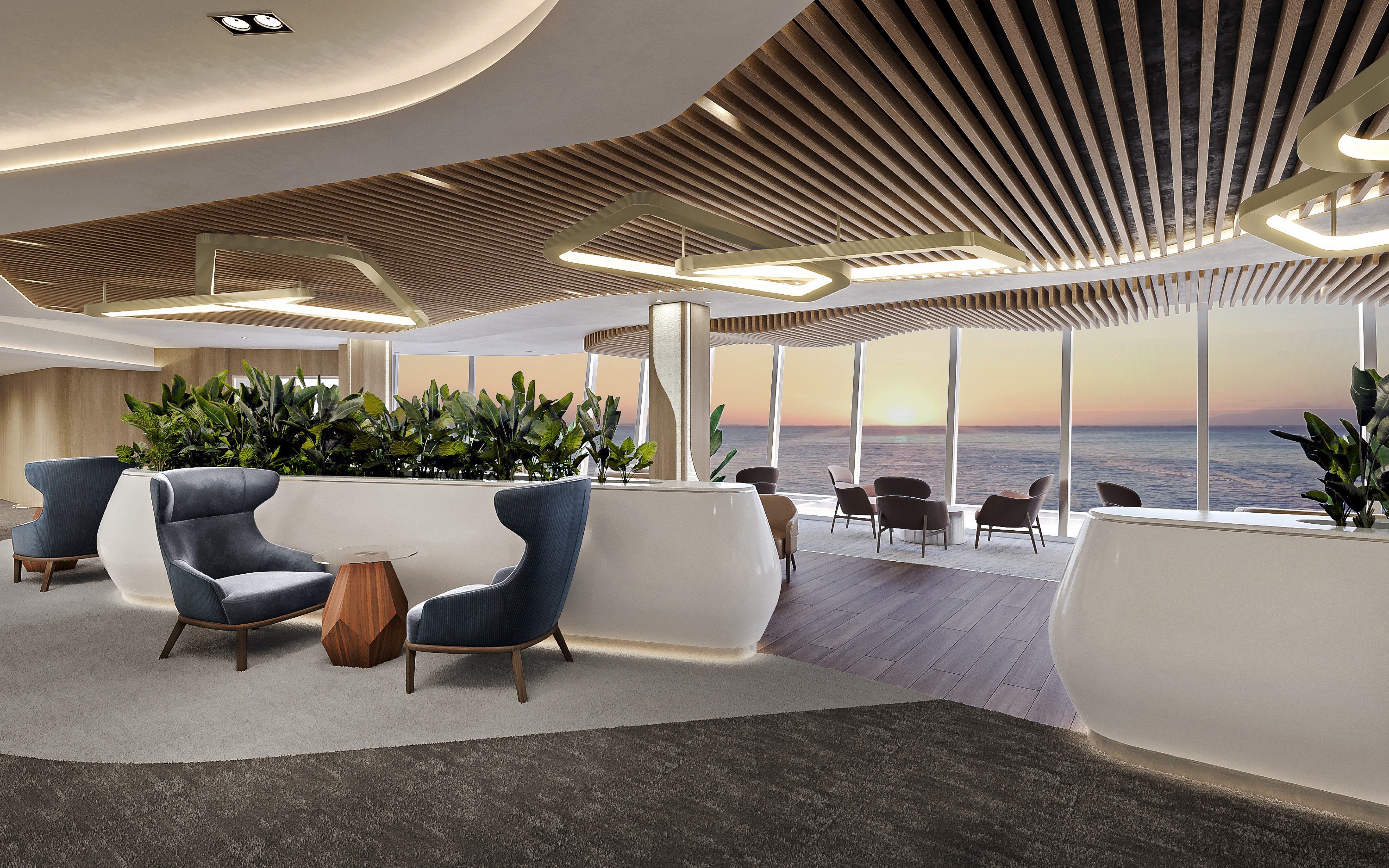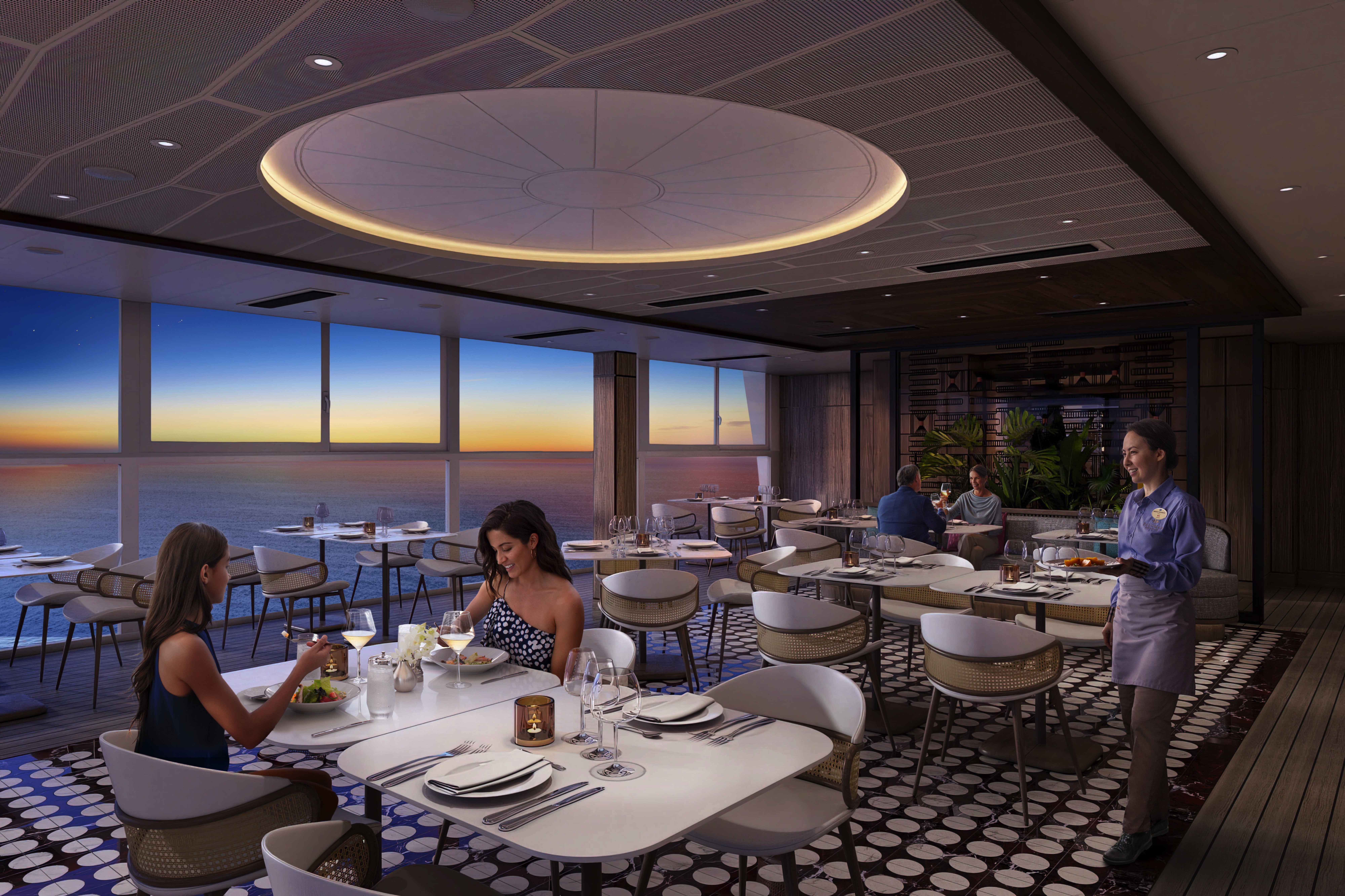 Designed to blend both indoor and outdoor experiences with stunning views of the ocean through grandiose floor-to-ceiling windows for panoramic views from the ship’s bow.