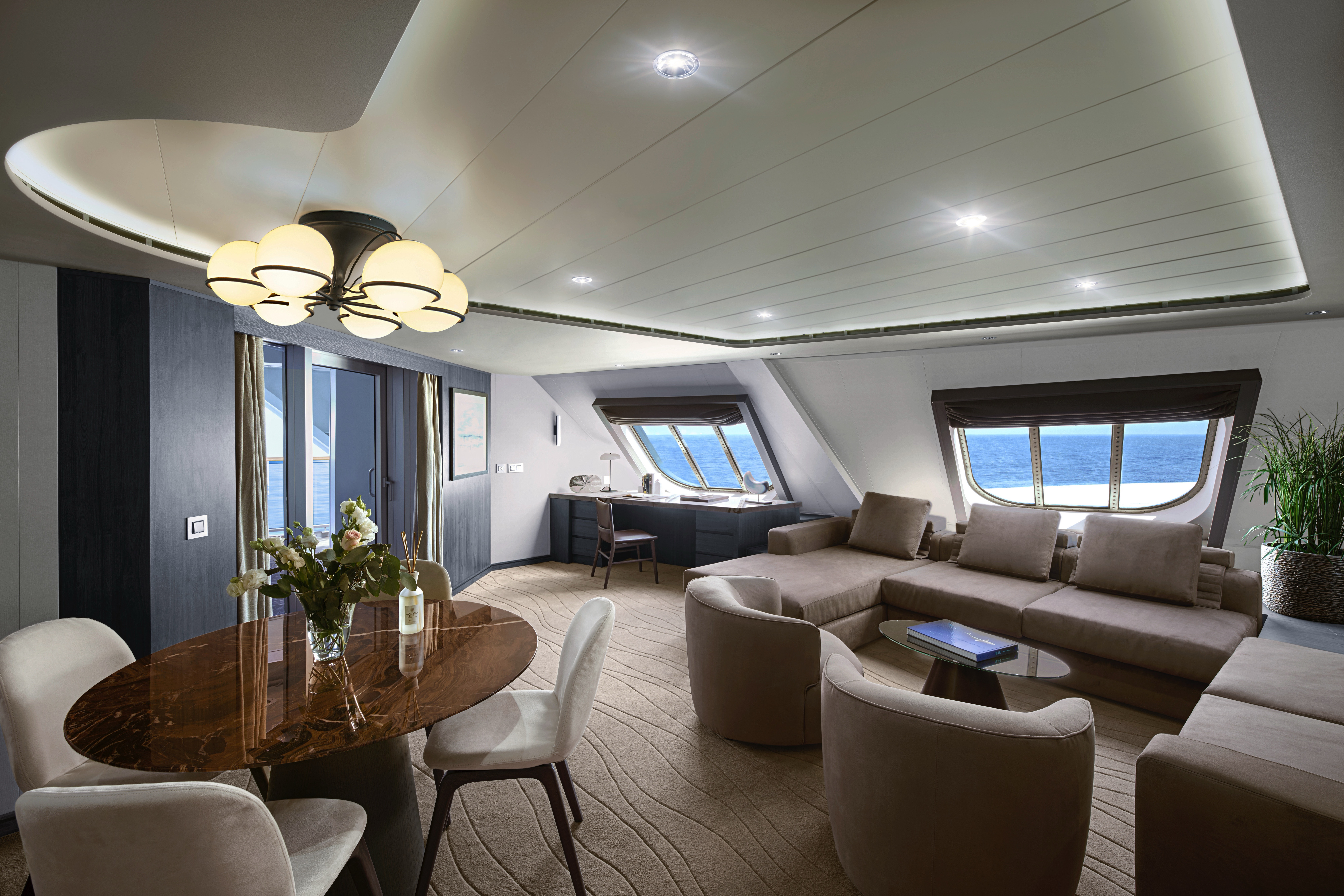 At the heart of the experience are our spacious Homes at Sea. Each of our Ocean Suites, Penthouses, and Residences is a truly serene retreat, featuring floor-to-ceiling windows bathing the space in light, opening onto generous private terraces, complete with daybeds and a dining area, seamlessly blending indoor and outdoor living. Inside, every detail has been considered, including a walk-in wardrobe with seated vanity area, luxurious bathrooms with custom toiletries, fine linens, and the effortless, impeccable service of our Perfect Hosts.