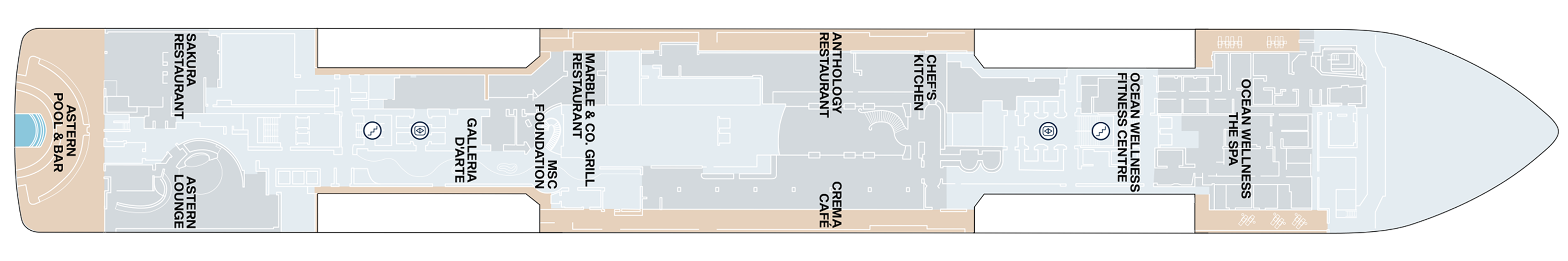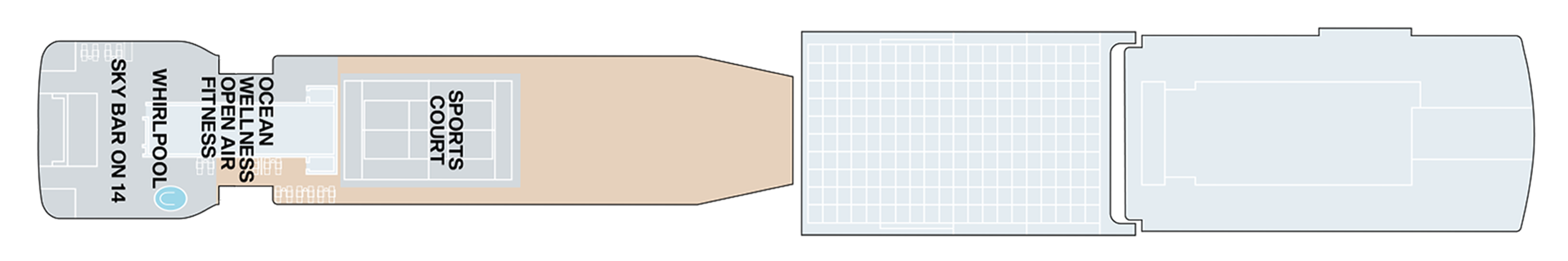 Ocean Wellness, our bespoke ocean-inspired wellness concept, has been thoughtfully reimagined, now encompassing a single, harmonious space designed to soothe and rejuvenate. The new wellness area includes Ocean Wellness – The Spa, a tranquil sanctuary offering experiences inspired by the power of the sea, as well as a state-of-the-art Fitness Centre and Fitness Studio, created in partnership with Technogym and featuring the most advanced training equipment. Completing the fitness experience is the one-of-a-kind Open Air Fitness space on Deck 14, where guests can train outdoors while taking in the views across the water.