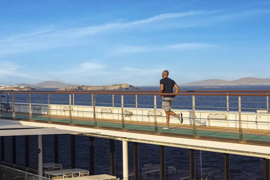 Located on Deck 4, fitness centre hours are posted at the door, with facilities available on a first come, first served basis.