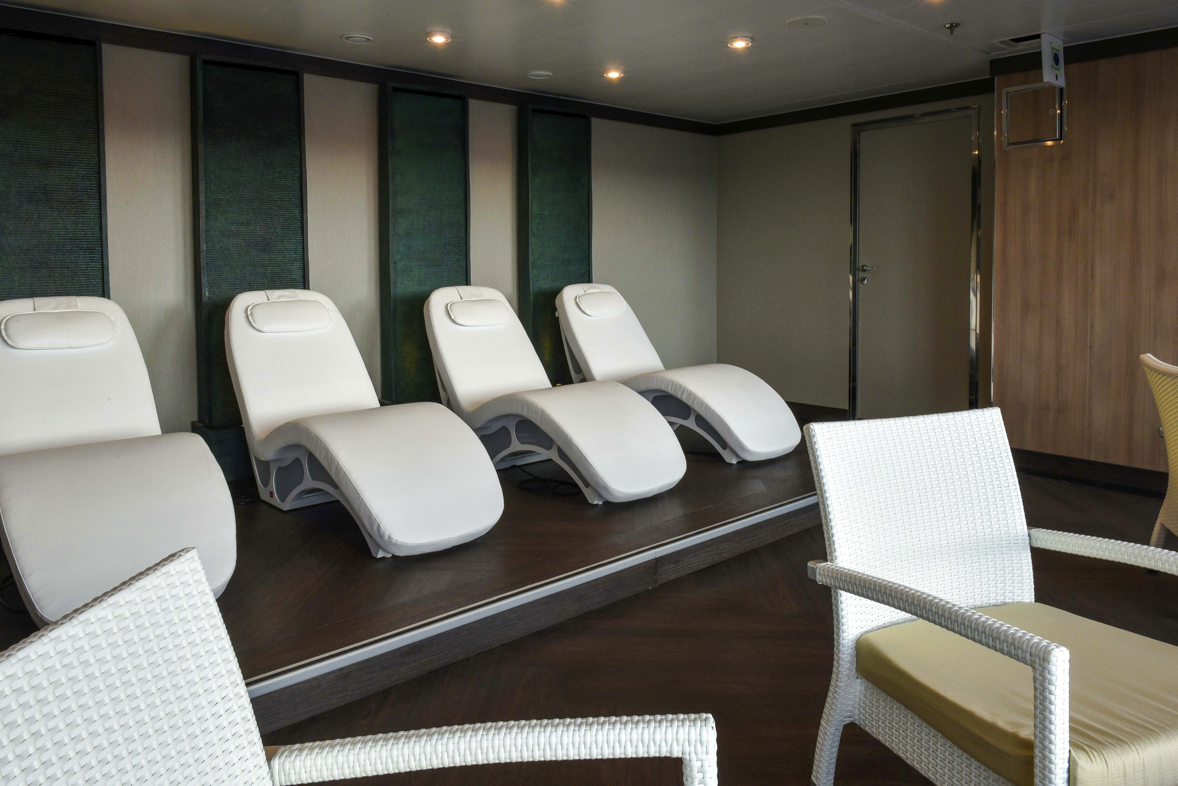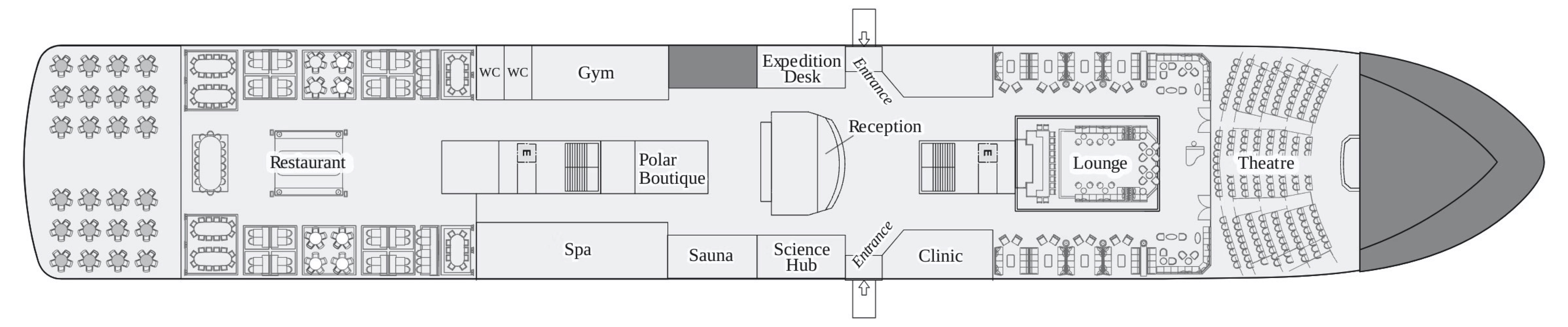 Wellness amenities, such as the spa, sauna, swimming pool, Jacuzzis and outdoor running track, allow guests to rejuvenate throughout their polar expedition. The beautifully designed restaurant and spacious lounges are ideal for guests to gather and engage in lively discussions about the day’s discoveries.