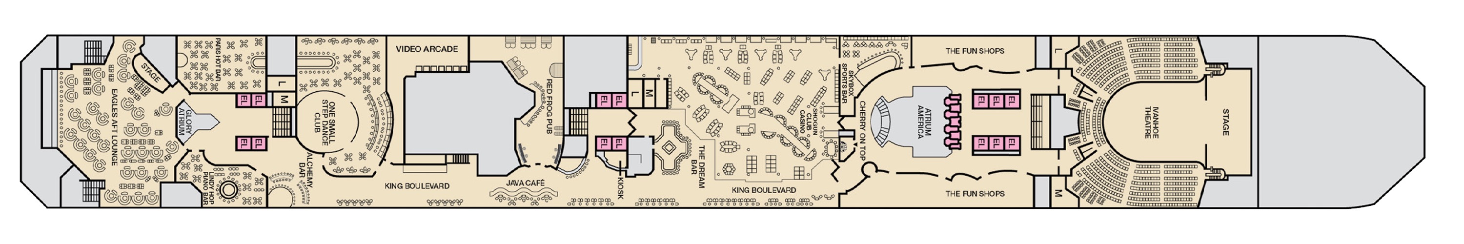 Here’s where you come in! The Atrium — the entrance to the ship and to vacation itself — is your first impression of all the fun to come. We make sure that this, the very heart of the ship, screams “welcome aboard the fun!” With multi-level panoramic views, the Atrium gives you the perfect place to enjoy all the hustle and bustle. There’s always music playing here, whether it’s a live band or a party-pumping DJ, plus enjoy events throughout the day or a drink at the bar, anytime. This 360-degree funspot is also home to the Guest Services desk, the place you go if you have questions for one of our certified fun experts… about just about anything that’s on your mind.