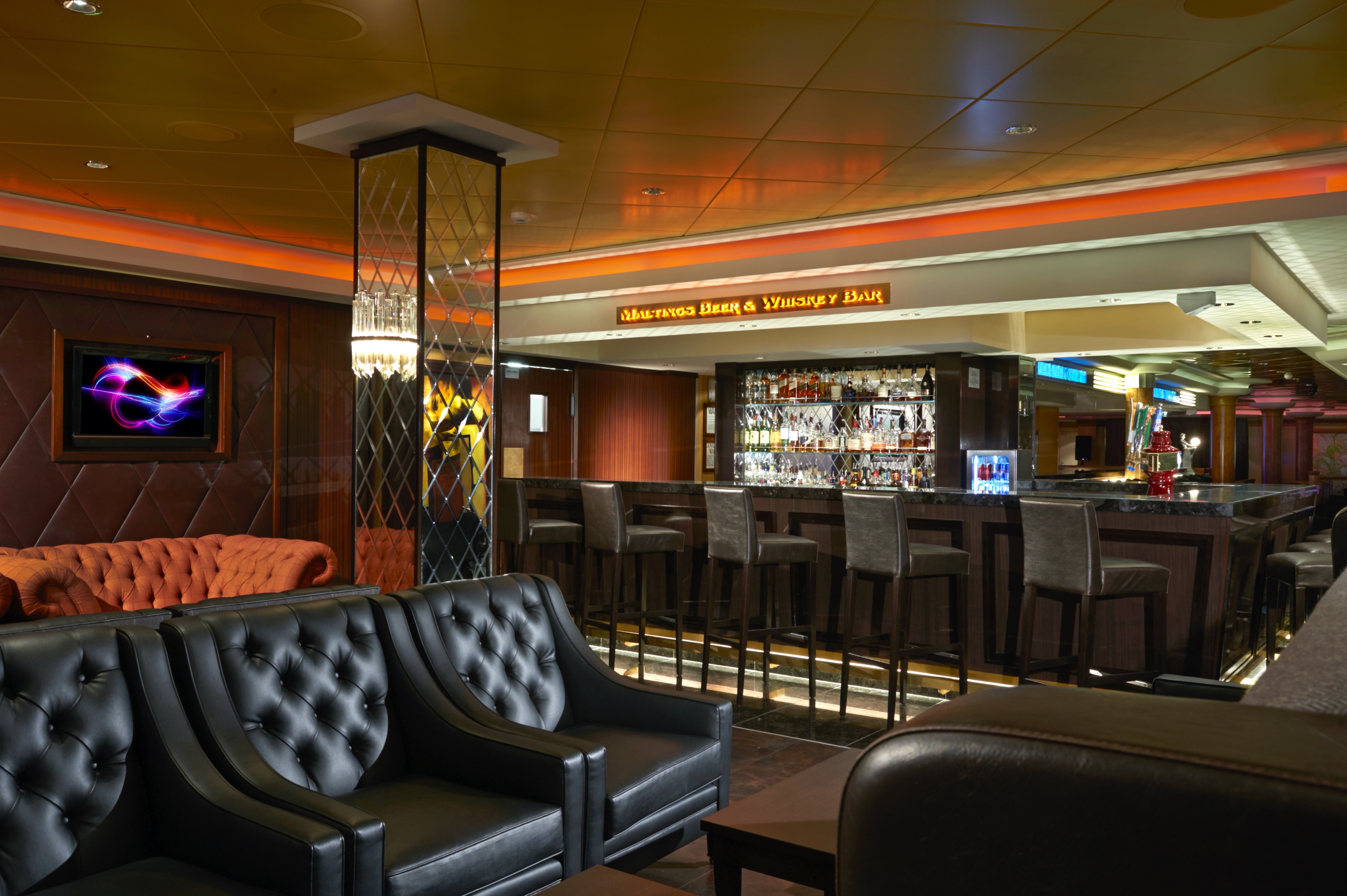 Art Deco inspired with a large screen behind the bar depicting James Bond inspired graphic silhouettes of funky images from the 60's & 70's.