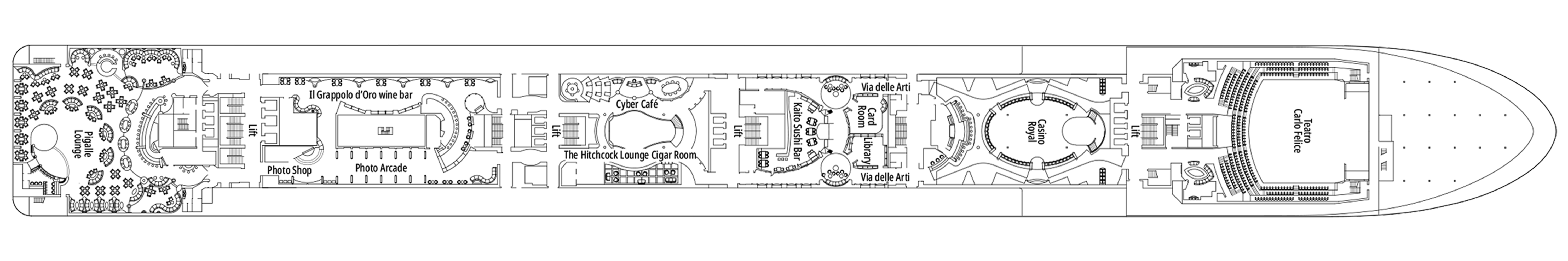 The 142 seat Piano Bar on deck 5 is the ship's reception bar, featuring live piano music and accompanying orchestra.