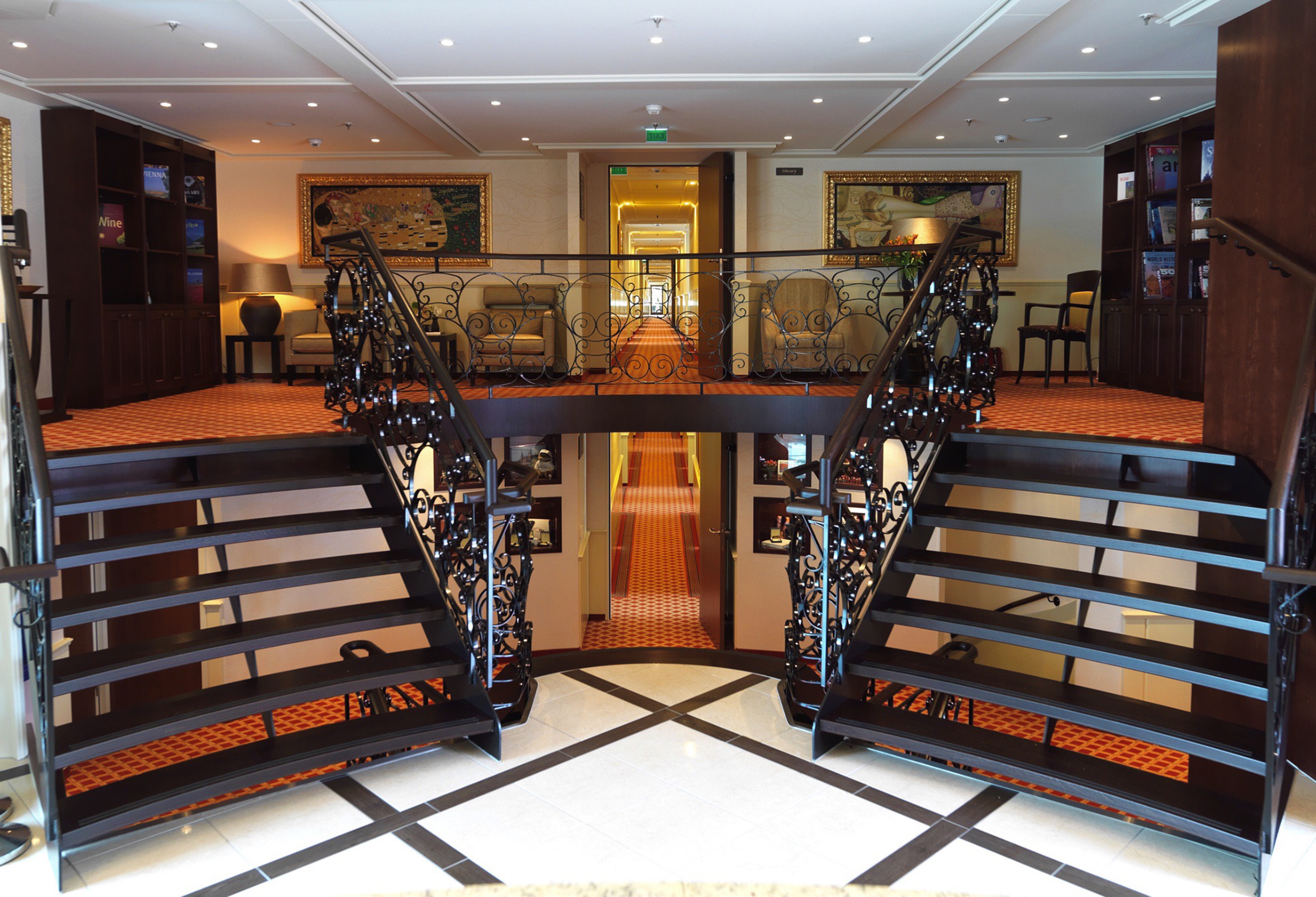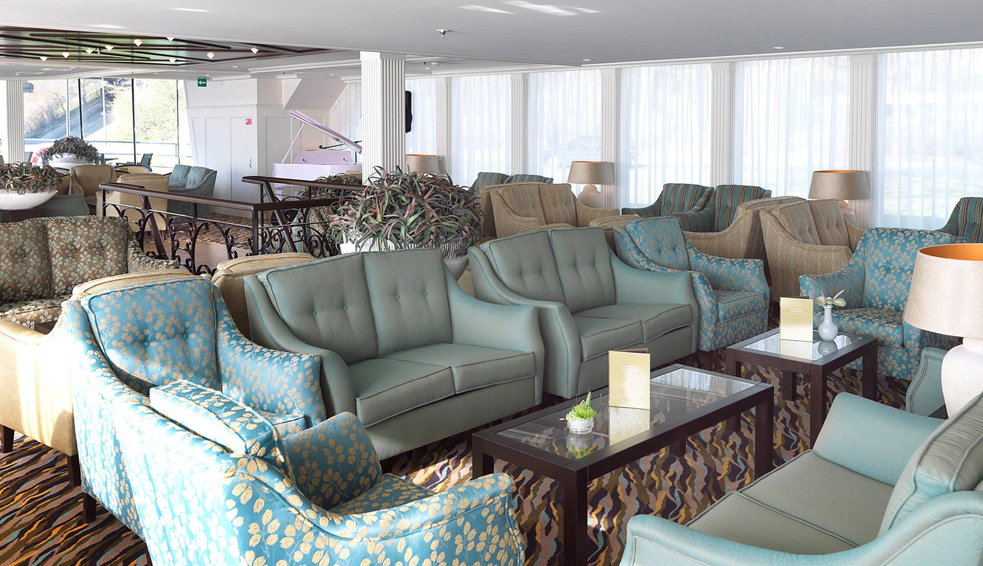 This versatile space hosts a bar, dance floor, plenty of comfortable couches and big windows on three sides and is used for everything from the morning port talks, daytime reading and chatting to scenic cruising, afternoon tea and evening entertainment.