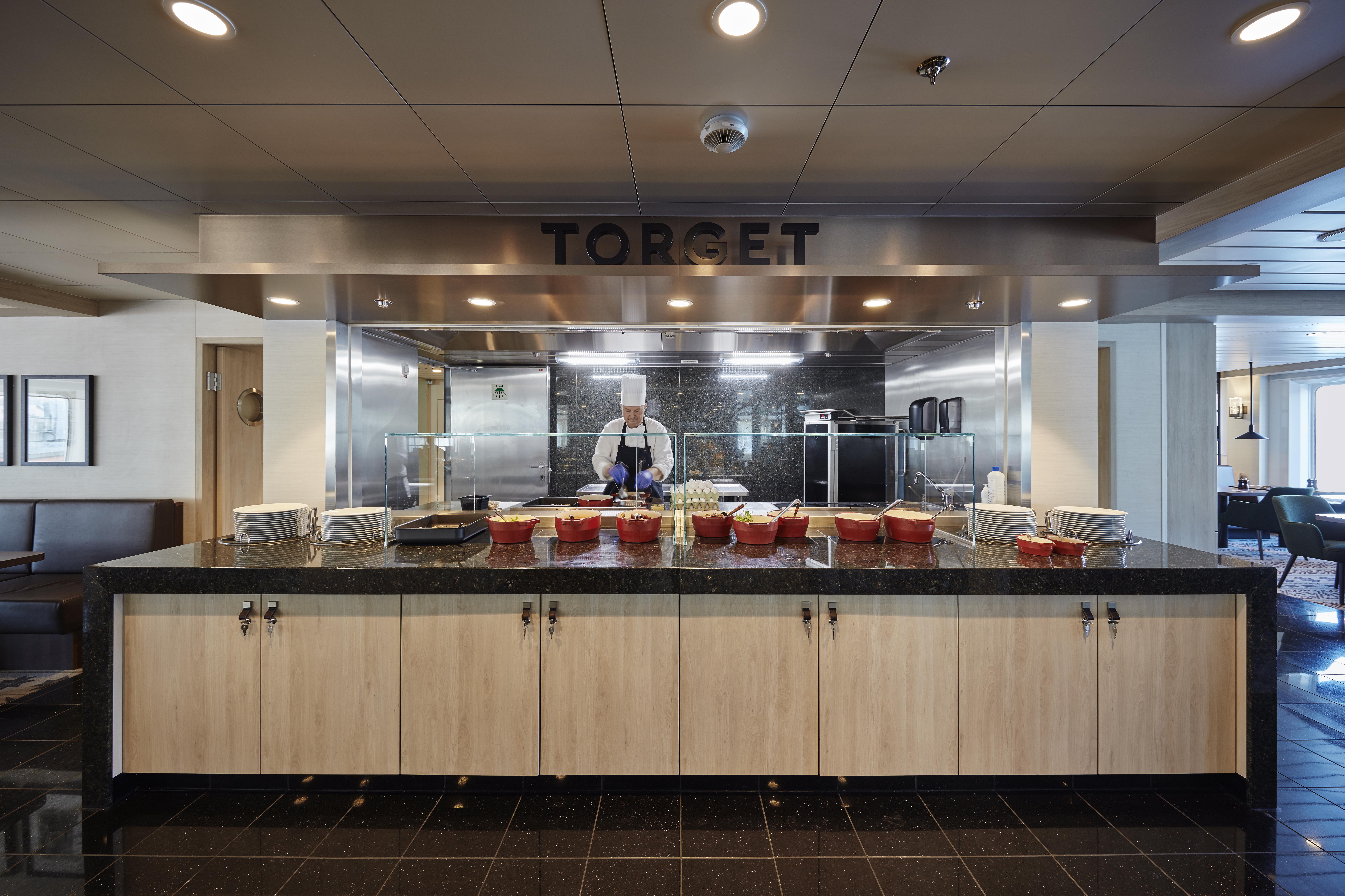 Meaning ‘marketplace’ in Norwegian, the main restaurant offers a variety for all three daily meals. For dinner, it provides either a buffet or set menus.