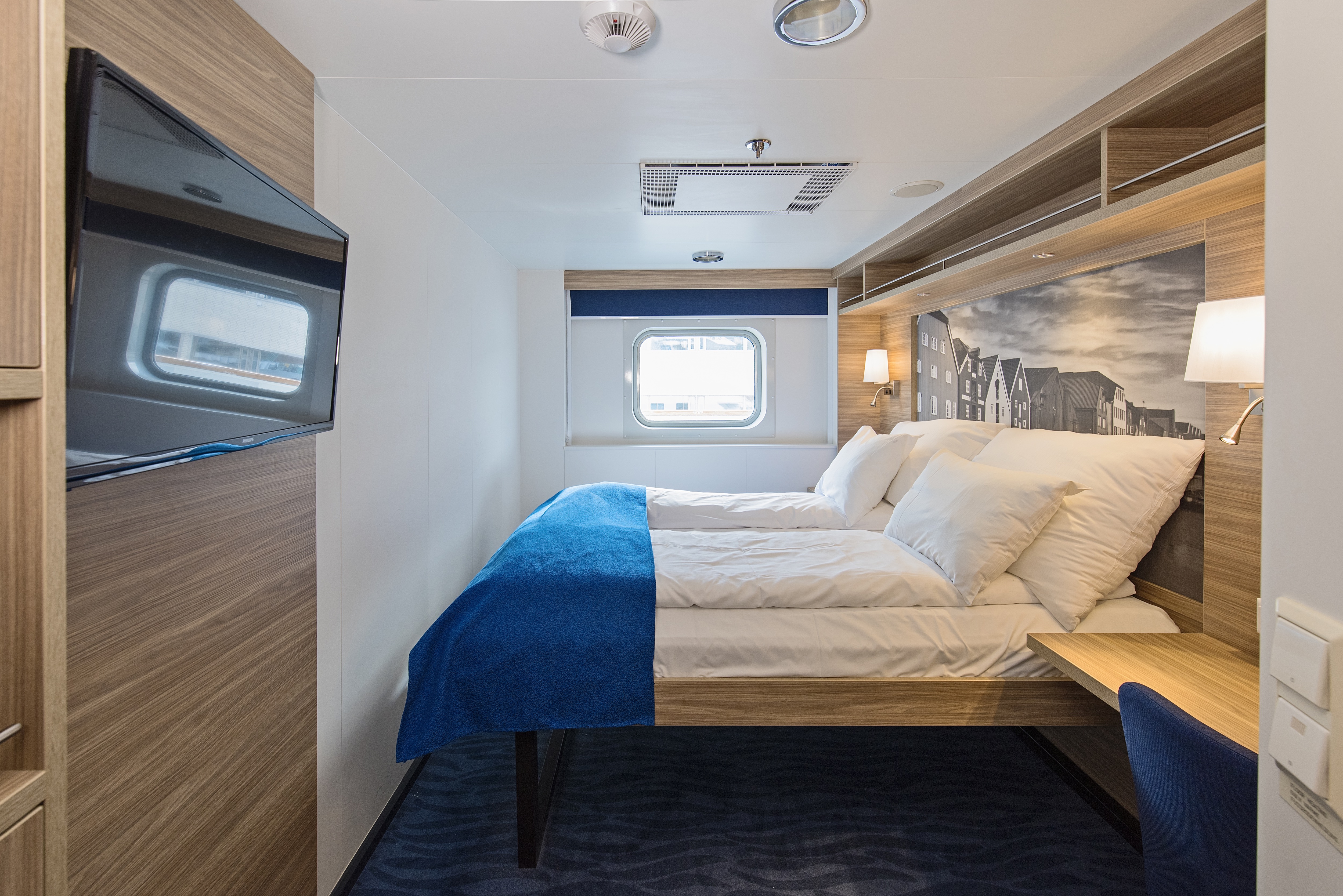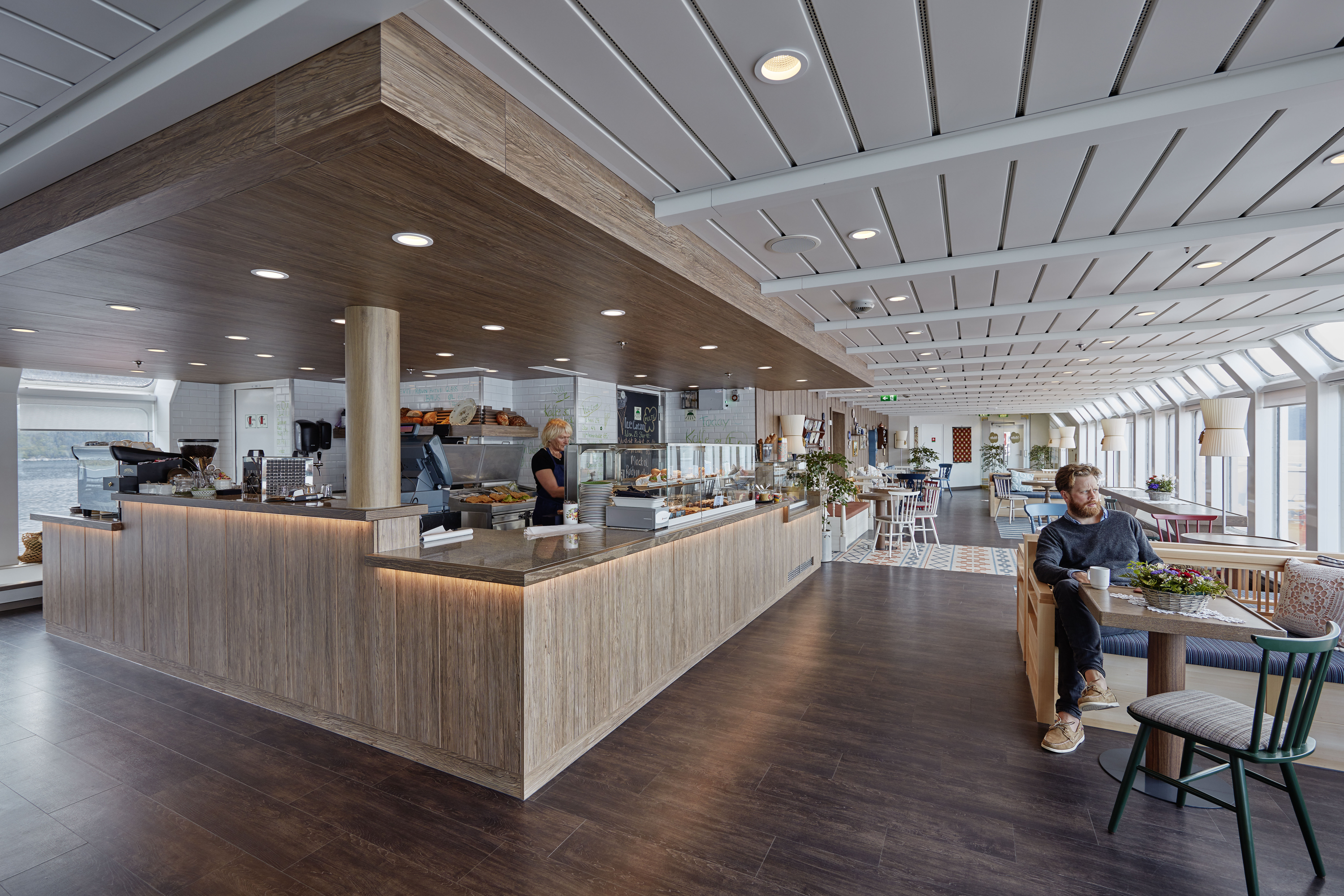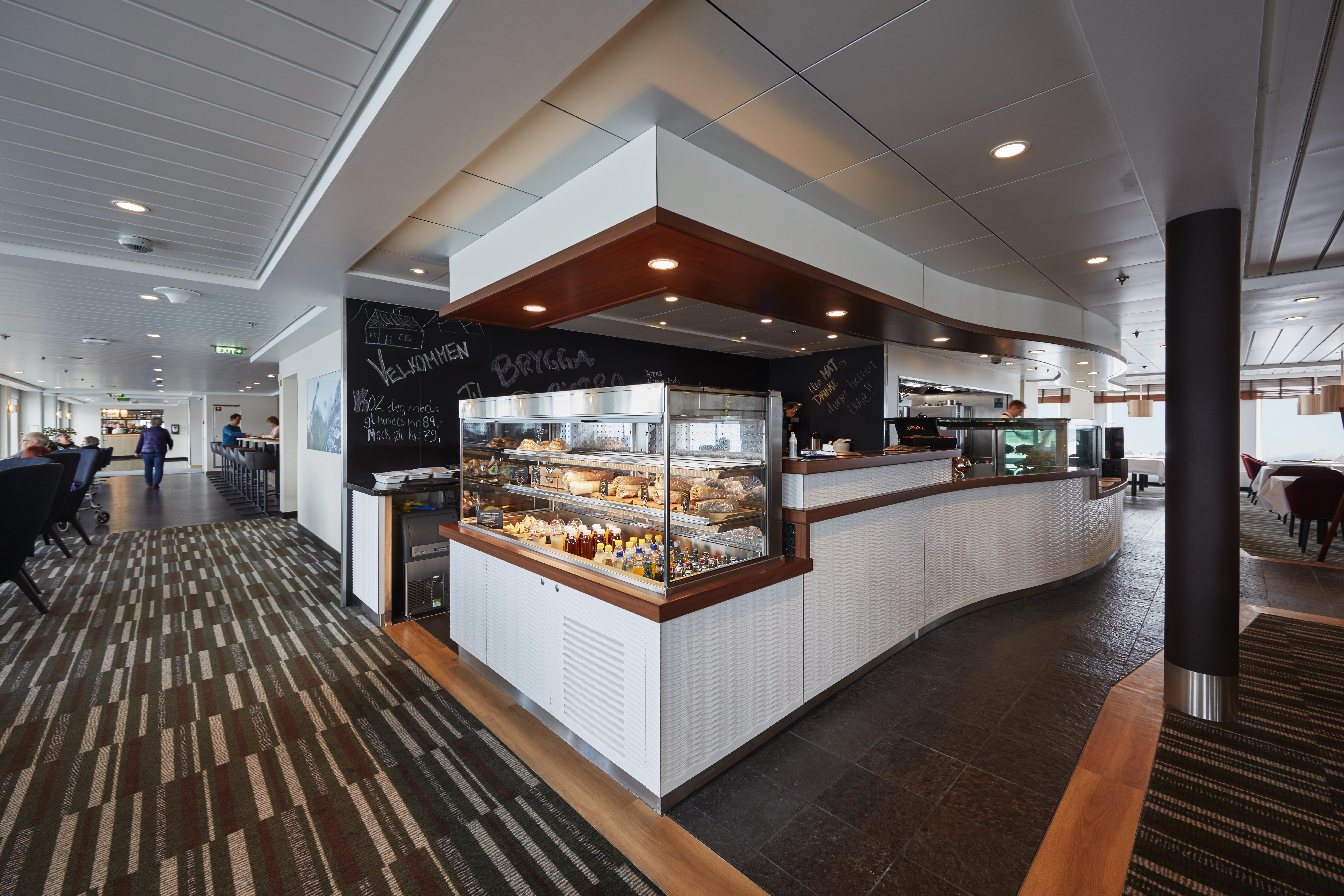 The name of our onboard bistro can be translated from the Norwegian as ‘wharf’. As you’ll probably see during your voyage with us, wharves on the Norwegian coast are typically busy places bustling with workers loading and unloading cargo, without much time for a relaxing sit-down meal.