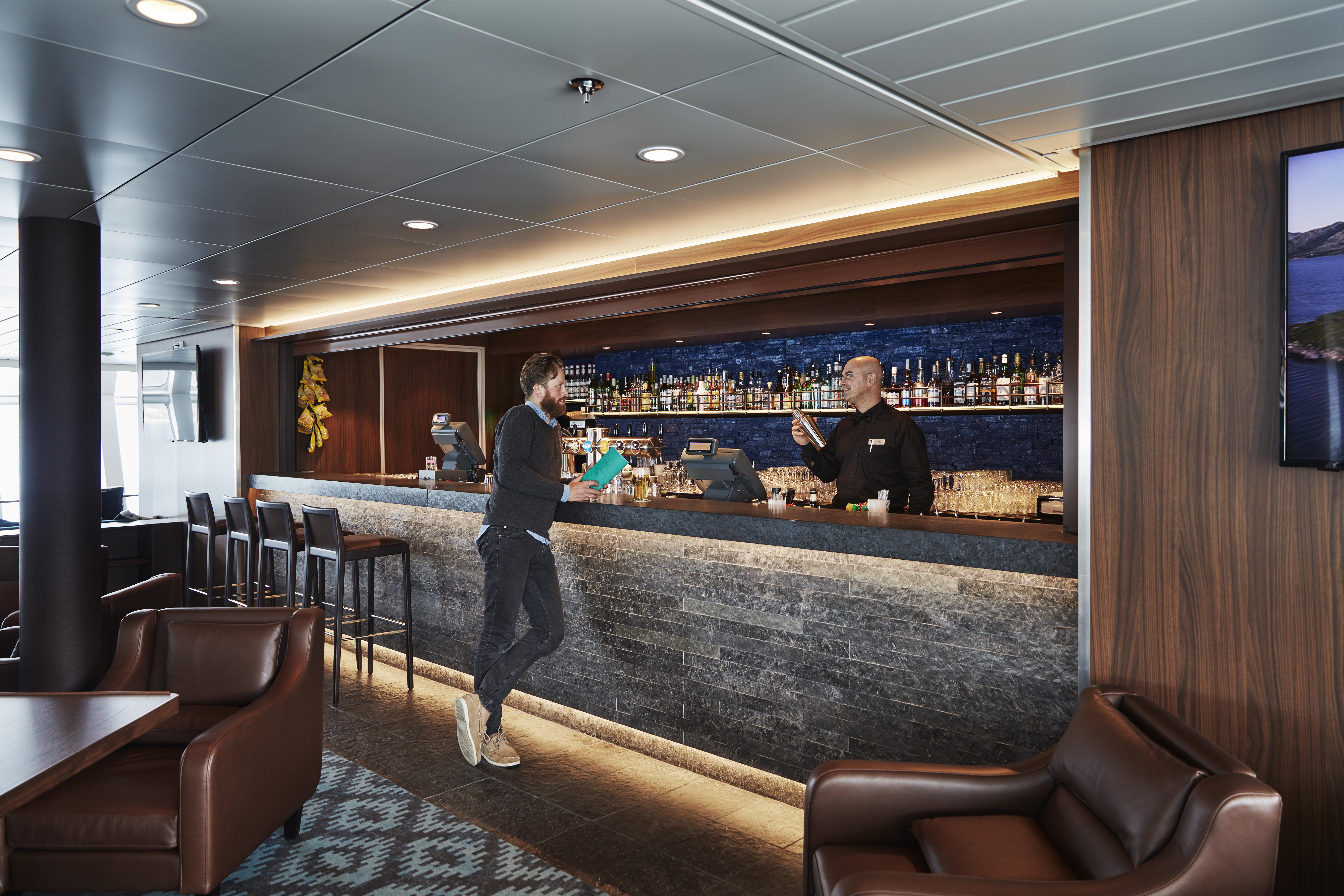 The Explorer Bar serves premium coffee, organic teas, hot chocolate, fruit juices, various Norwegian beers, red, white, and rosé wine, and a collection of Norwegian aquavit that would make any spirit lover jump for joy.