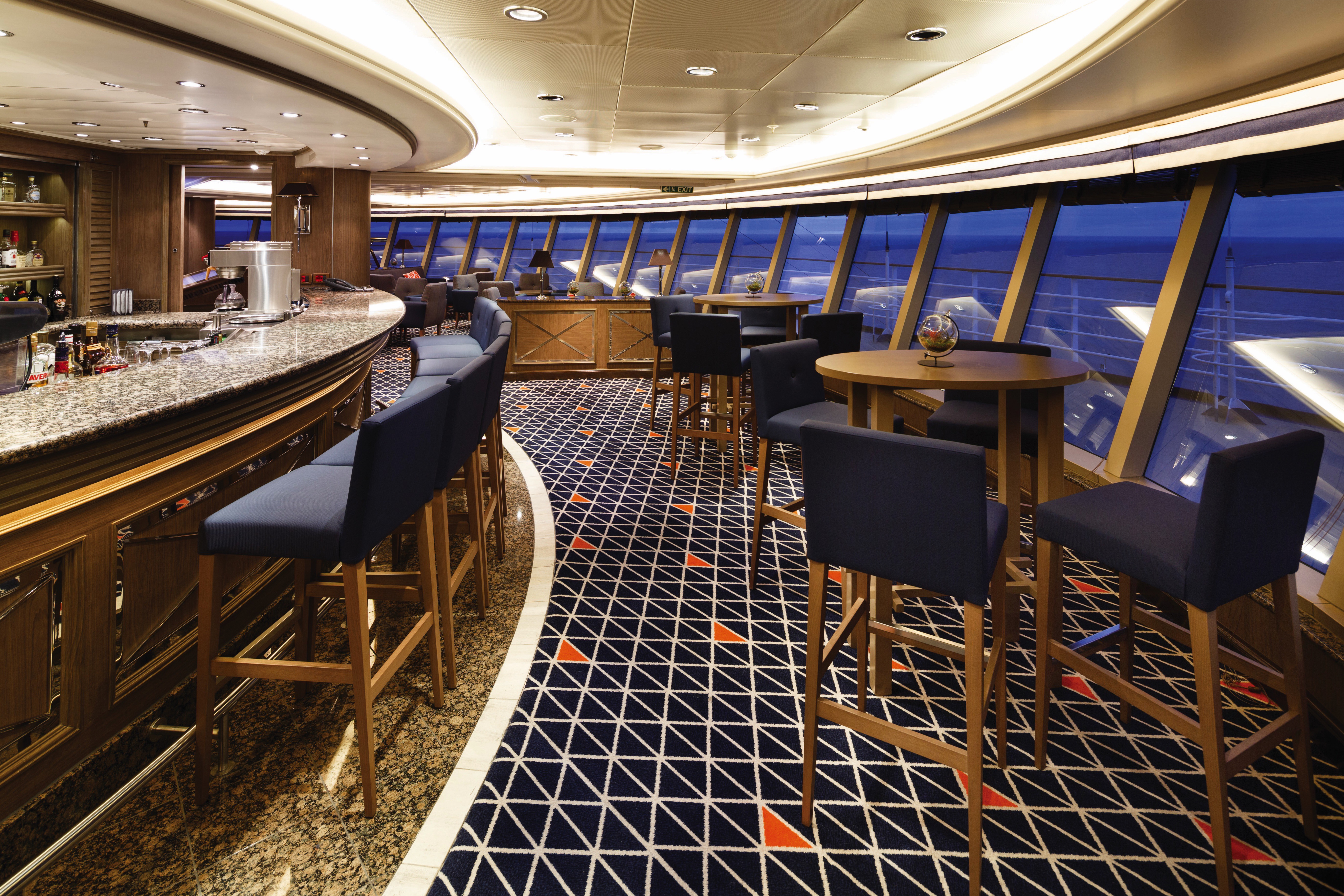 This luxury cruise ship’s Panorama Lounge is specially designed to provide an uninterrupted view of the day’s destination from the comfort of the ship’s interior. This is an ideal place to unwind, enjoy afternoon tea, listen to the pianist, and watch the setting sun. The drinks are complimentary, and the music is live and inviting. Enjoy dancing to a range of musical styles for every taste, from the classics to the latest club mixes.
