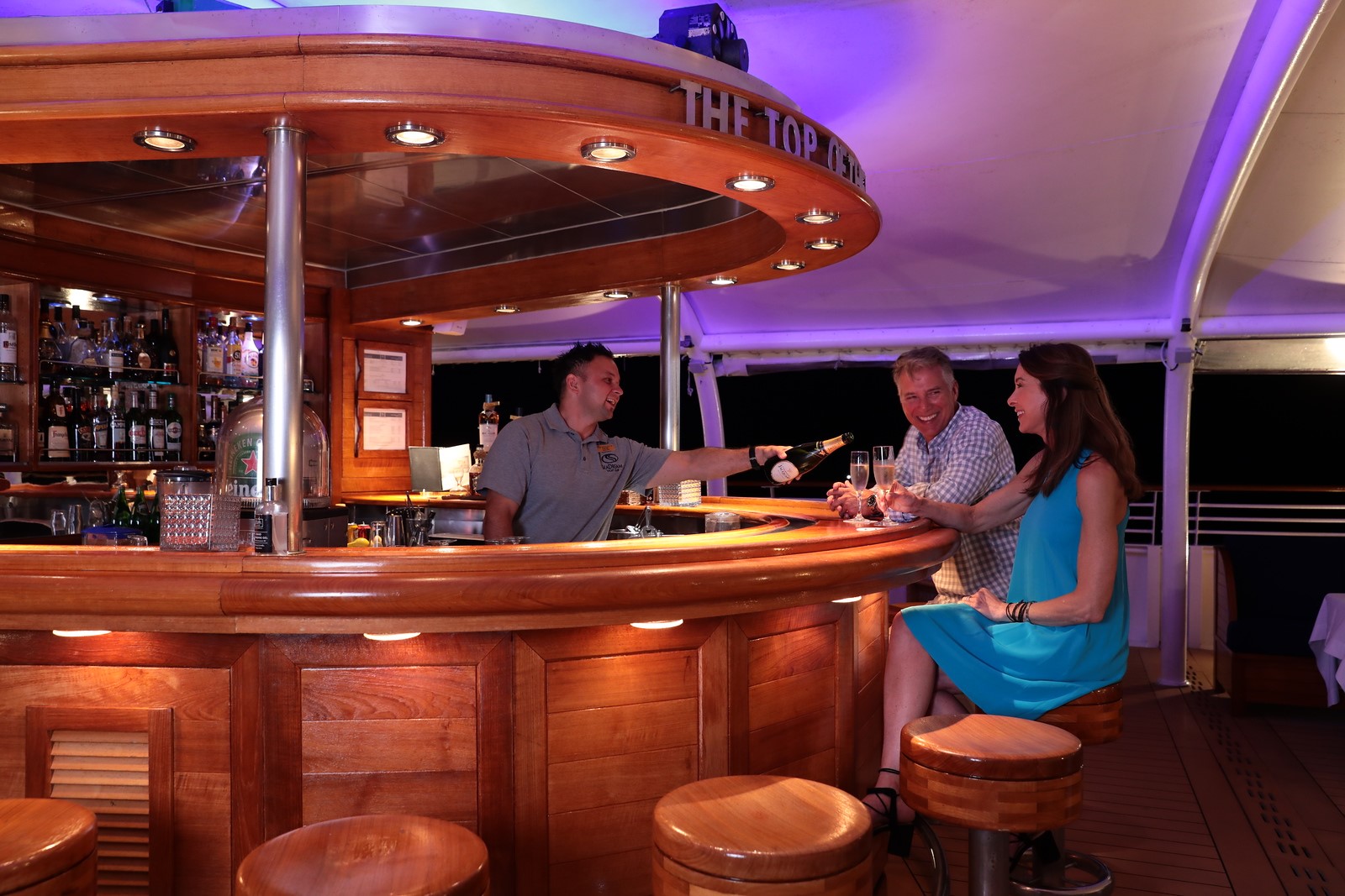 As day turns to night, enjoy the picturesque sunsets at the Top of the Yacht Bar. The night sky transforms the deck to a memorable night with accompanying music and a social atmosphere. Mingle with friends you meet on board for a night of cocktails, live guitar music, dancing and 360º views of the twinkling stars.