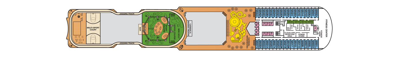 Your Carnival cruise may take you far, far away from the competitive daily rat-race, but you’ll find an oasis of friendly competition at SportSquare™. Take on friends at mini-golf, battle strangers at basketball, or push yourself to new heights at our Ropes Course... or to record-setting low times at the jogging track. SportSquare gets you in the game with soccer and volleyball (the b-ball court converts!), brings pool, foosball and ping-pong to the table, and rounds things out for shaping up with your choice of stationary bikes, elliptical machines, and weight-lifting equipment. Are you game? (SportSquare offerings vary by ship.)